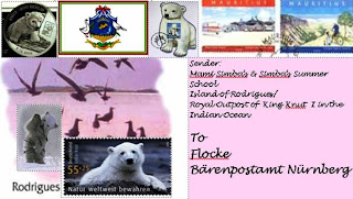 Colorful stamps with flowers and fish (on the back...) attracted her eyes, when she opened her post office box at Bear Post Office in Nuremberg. Her heart started to beat faster when she took the envelope into her paws to open it. There it was- finally! Without even looking on the sender’s address, she knew immediately where it came from: Mami Simba’s & Simba’s Summer School Department in the Royal Outpost of King Knut in the Indian Ocean. King Knut…again! You couldn’t escape him. His picture was everywhere. But this time she couldn’t care less as scrolling through the last paragraph of the letter, she found the sentence she had been waiting for so long: Admitted as participant of a research study on Rodrigues Island! The 11000 km of distance between that tiny little island which could barely be found on a map and King Knut’s residency, were exactly what she needed right now…. During the last year she had to come to detest everything connected with him, so fed up she was of been surrounded by all these King-Knut-here-and-King-Knut-there news and info’s. It seemed as if the whole world couldn’t live any more without knowing if he had 3 or 4 fish for breakfast or if he was still counting his jute bags or preferring green salad leaves to orange pumpkin pieces. She had even heard about cases who discussed the consistency of his anal businesses.