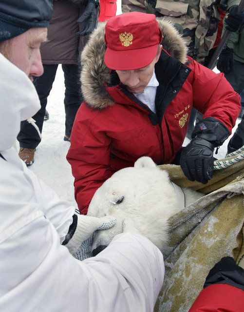 Wladimir Putin hat eine neue Kostprobe seiner Berufung zum Abenteurer gegeben. Als Öko-Krieger half er Wissenschaftlern in der russischen Arktis dabei, vom Aussterben bedrohte Eisbären aufzuspüren und mit Peilsendern zu versehen. Angetan mit einem roten Mantel und roter Mütze kniete sich der 57-Jährige neben den Kopf eines betäubten Eisbären, dem ein Sender angesteckt wurde, und half dabei, das schwere Tier zu wiegen.