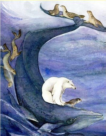 Peregrine Falcon hired Whale to carry his passenger. He sat on Whale's forehead, calling out the directions. Polar Bear sat on the shoulder, gazing at the sea. The Seals, who had begged to go with her, sat on the tail.After some days, they came to the North Pole, where it is all snow and ice."Here you are," cried Peregrine Falcon."Everything just as I said. No crowds, no dirt, nothing but beautiful clean whiteness.""And the rocks actually are mirrors!" cried Polar Bear, and she ran to the nearest iceberg to to repair her beauty after the long trip.