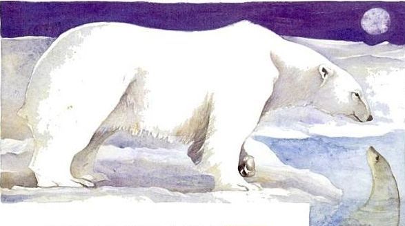 One day he went up to Polar Bear. Now Peregrine Falcon had been to every country in the world. He was a great traveler, as all the creatures well knew."I know a country," he said to Polar Bear, "which is so clean it is even whiter then you are.Yes, yes, I know, you are beautifully white, but this country is even whiter. The rocks are clean glass and the earth is frozen ice-cream. There is no dirt there, no dust, no mud. You would become whiter than ever in that country. And no one lives there. You could be queen of it."