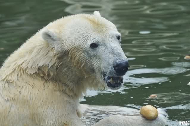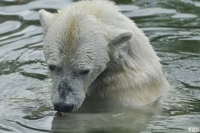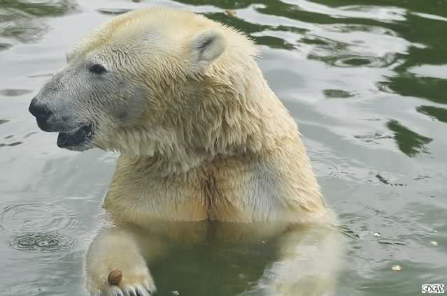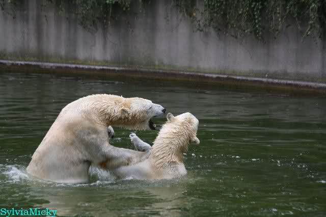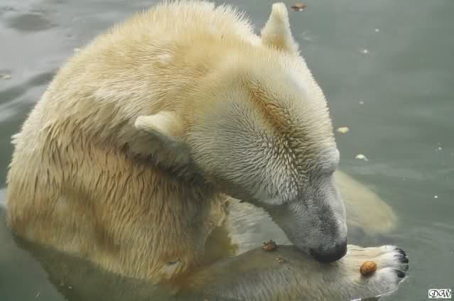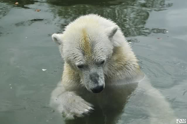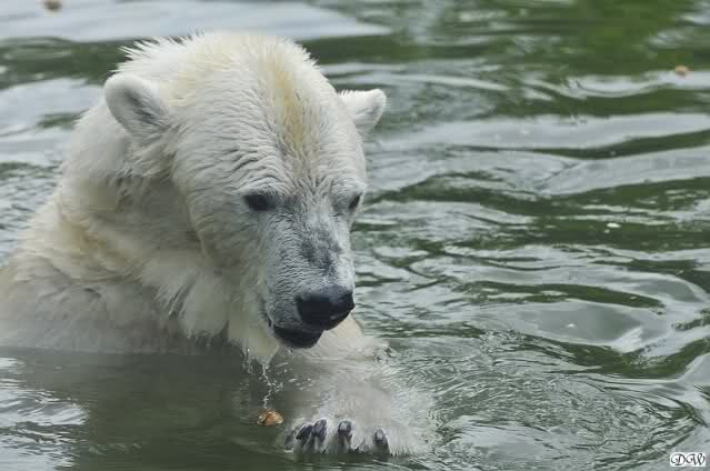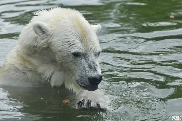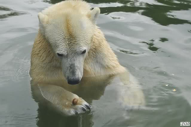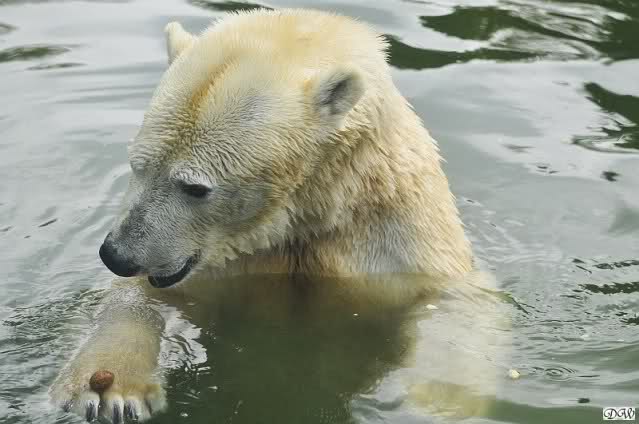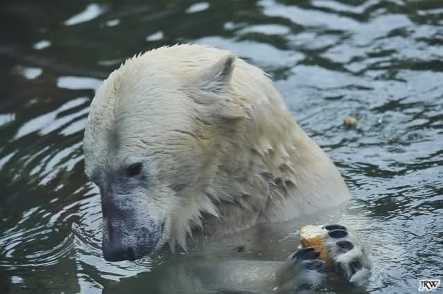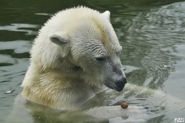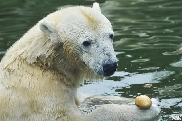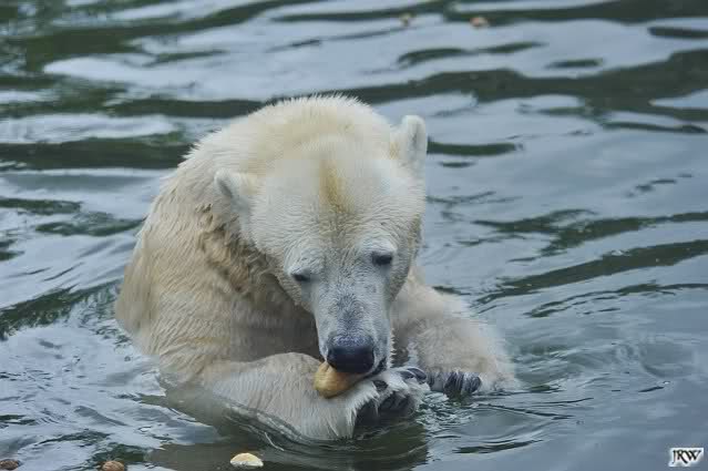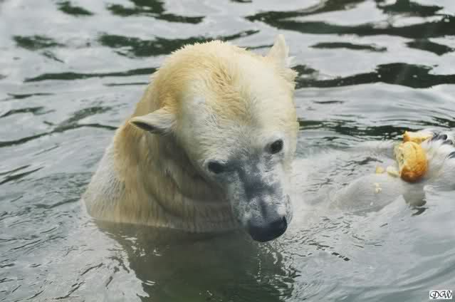 Übermütig spielt am Montag (22.03.1999) Eisbär "Lars" mit einem Plastikkanister im Wasserbecken seines Geheges im Tierpark Neumünster. Das sechs Jahre alte und rund 800 Kilogramm schwere Raubtier geht lieber seinem Spiel- als seinem Fortpflanzungstrieb nach. Vor zwei Jahren kam "Lars" aus München um zusammen mit der 26jährigen "Moskwa" für Nachwuchs zu sorgen. dpa