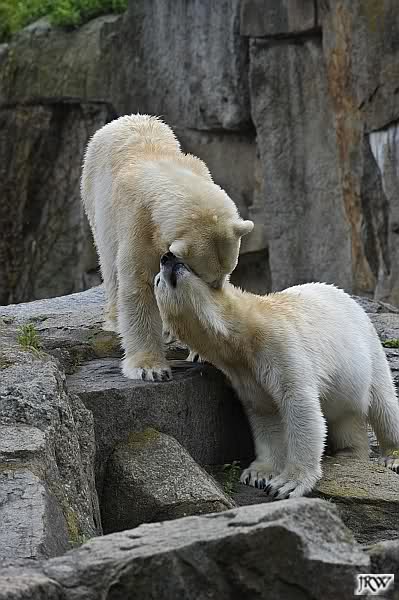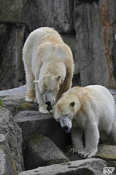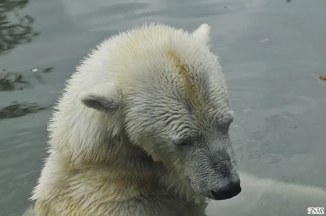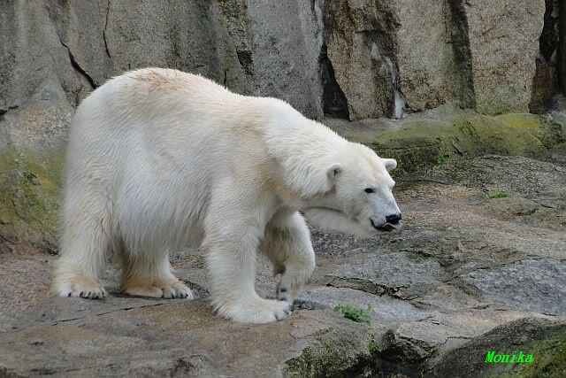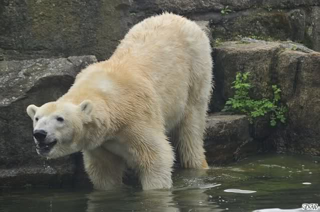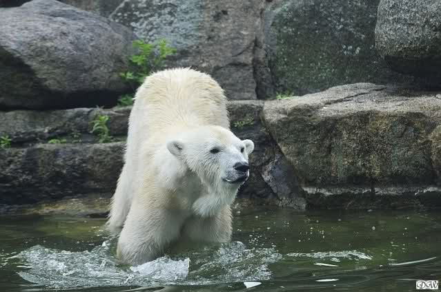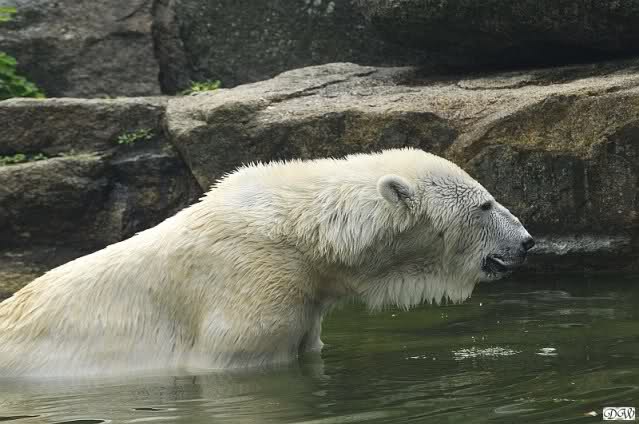 Aufgerichtet verfolgt der sechs Jahre alte Eisbär "Lars" am Donnerstag (26.11.98) im Tierpark in Neumünster seinen Tierpfleger. Das große Zittern kennt "Meister Petz" mit seinen rund sieben Zentner Gewicht nicht. Während viele Vier- und Zweibeiner bei Schnee und kaltem Wetter in Schleswig-Holstein frieren, trollt sich der "Schneebär" in der weißen Pracht in seinem Freigehege.