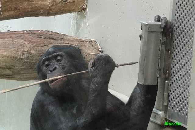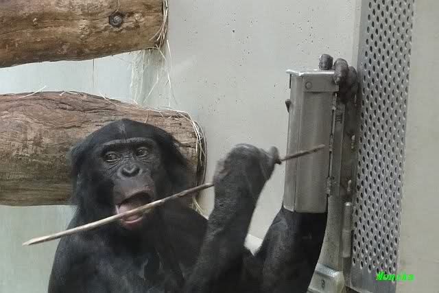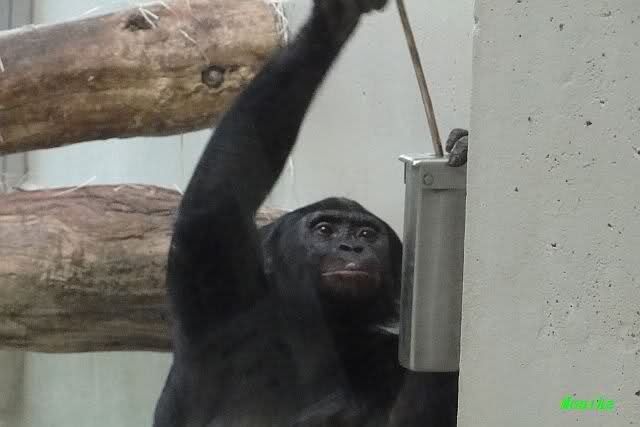 Bei den Bonobos gab es heute etwas Süßes, das sie mit einem Stöckchen aus dem Automaten holten.
