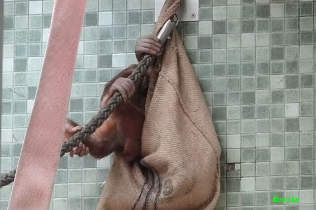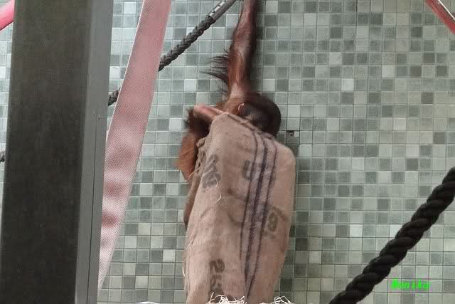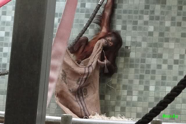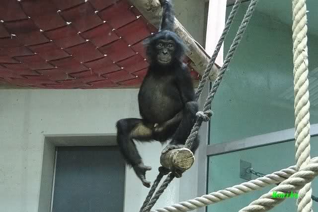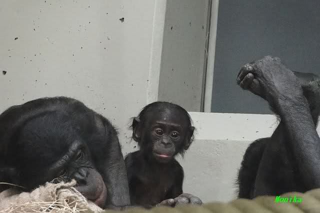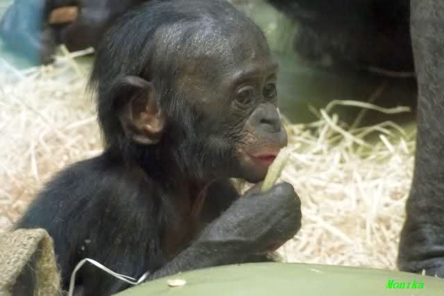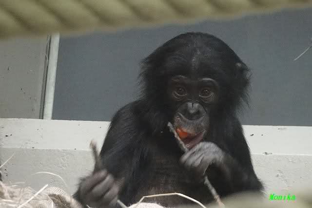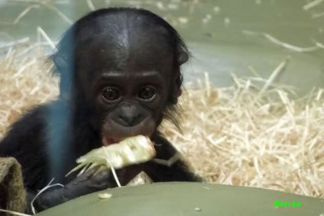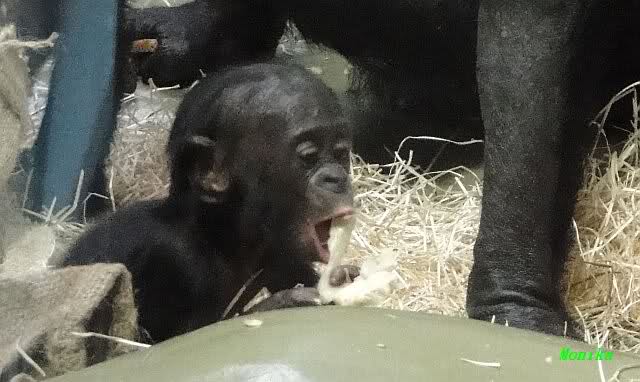 Das kleine Bonobo-Mädchen "Likemba" wird immer selbstständiger. Sie läuft inzwischen alleine durch den Käfig, und probiert auch schon vom Gemüse.