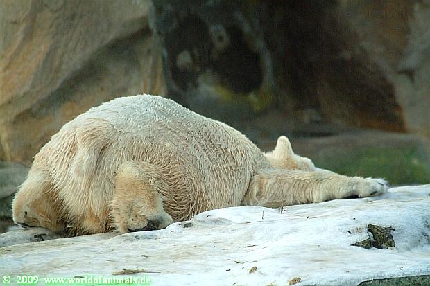 Als ich heute in den Zoo ging, lag Knut in der Felsennische. Wie mir eine Zoobesucherin erzählte ist Knut heute vormittag öfters ausgerutscht. Er fühlte sich wohl in der Nische sicher. Auch im Laufe des Tages rutschte er aus. Warum allerdings dies bei einigen Zoobesuchern Gelächter auslöst, vermag ich nicht zu verstehen. Was ist so lustig daran, wenn Knut ausrutscht und sich vielleicht verletzt? Das ist wohl der Unterschied zwischen Tierfreunden und Zoobesuchern.