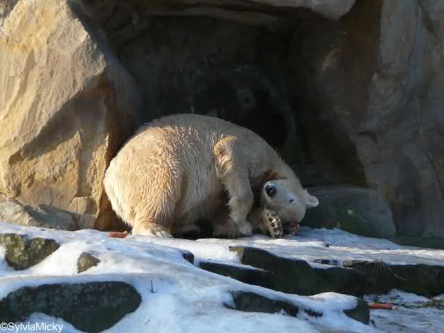 Das Futter bekam der Eisbär teilweise nach oben auf die Anlage geworfen, den anderen Teil nach unten (?). Das sich der Bär mit dem Eis schwer tat, dürfte Jedem klar sein.
