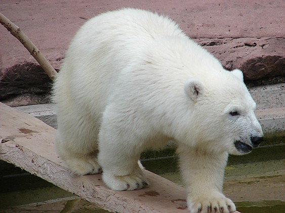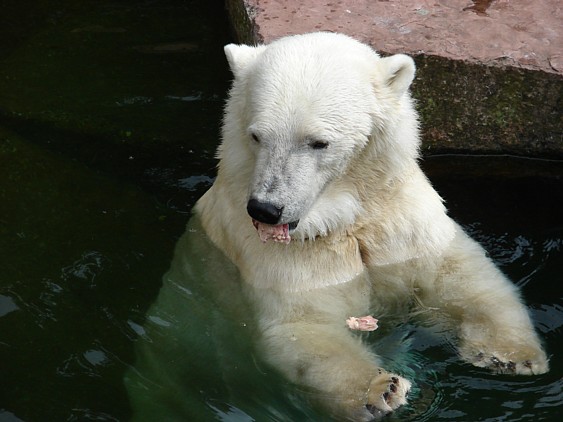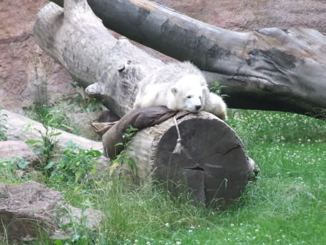 Mir scheint schon, dass sich die Kleine alleine langweilt. Sie hat gar keine Lust zum spielen, sondern liegt meistens und nölt vor sich hin, wenn sie nicht gerade zur Tür läuft um zu sehen, ob nicht doch jemand öffnet und sie reinlässt oder zu ihr ins Gehege kommt. Ich habe allerdings vorhin im Gästebuch der offiziellen Flockeseite gelesen, dass sie anscheinend immer noch mit den Zähnen zu tun hat, vermutlich kommt da alles zusammen. Ich habe heute zwar Herrn Maußner zweimal kurz gesehen, aber er war so schnell wieder weg, dass ich ihm keine Fragen stellen konnte. Auf jeden Fall hat Flocke eine gut funktionierende innere Uhr, so ca. 15 Minuten vor 11 wurde sie plötzlich munterer, ist auch mal ins Wasser, hat sich ein wenig im Heu gewälzt und für mich war klar, dass sie weiß, dass sie gleich rein darf. Und irgendwie schien mir, als wäre sie in den letzten zwei Wochen doch ein ganzes Stück gewachsen, vor allem die Pfoten Sie ist wirklich ein wunderschönes Bärchen.
