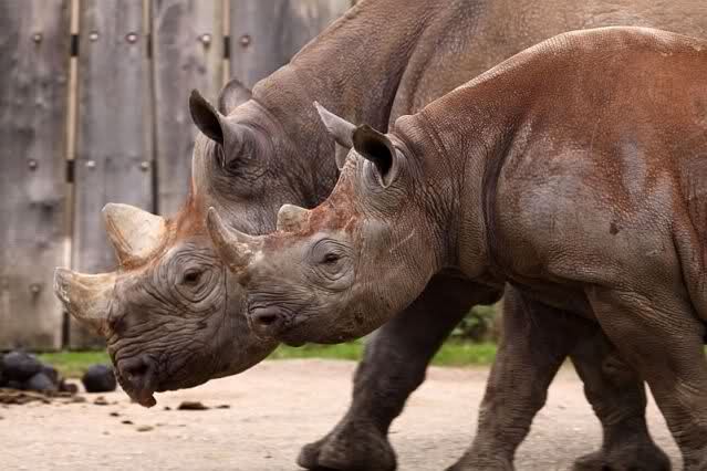 Nashornkuh "Nane" drehte eine kurze Runde mit dem Nachwuchs