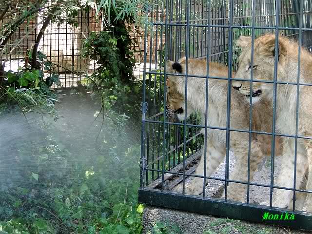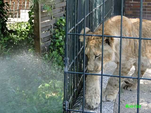 Ein Gärtner sprengte vor dem Gehege der beiden Löwenkinder. Nathan und Miron zeigten reges Interesse.