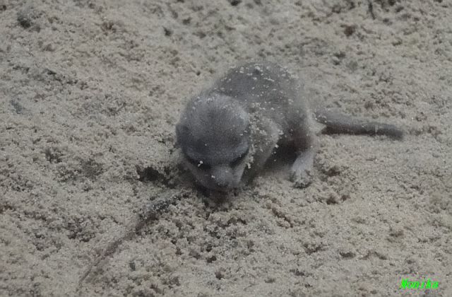 Vor 5 Tagen gab es wieder Nachwuchs bei den Erdmännchen. Dieses Kleine lag ganz alleine und zitternd vor der Glasscheibe.