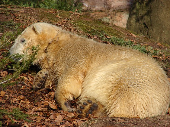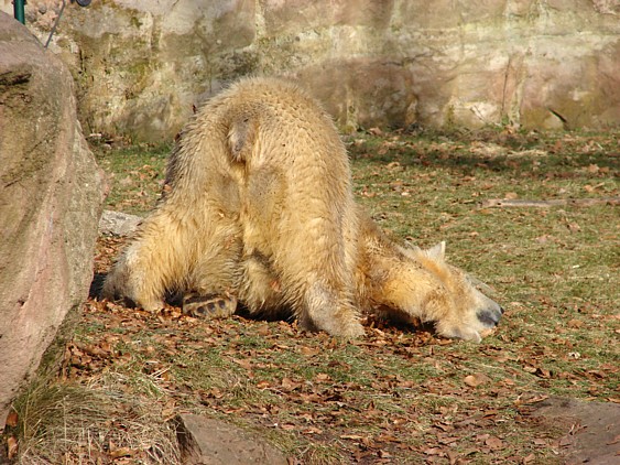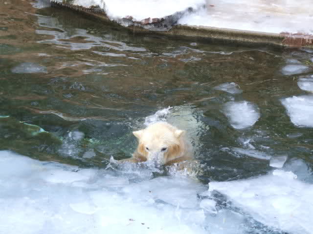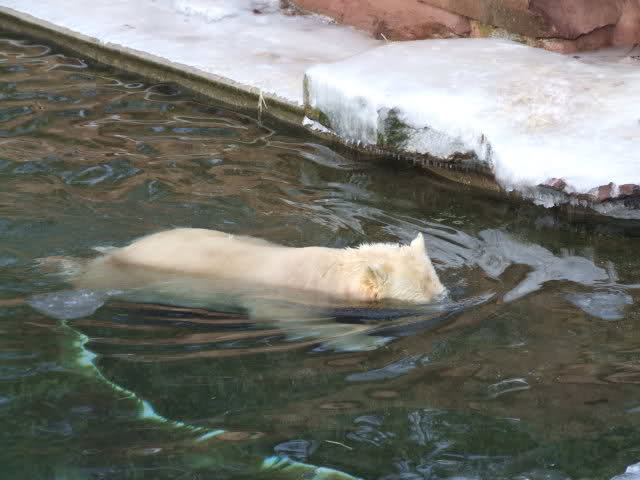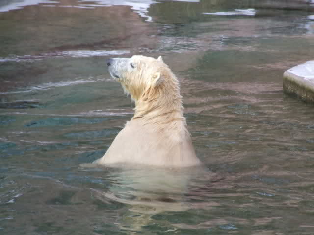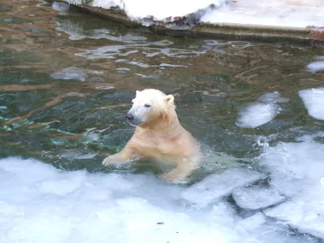 Nachdem ich letzte Woche krank war, dachte ich mir, dass ein bisschen frische Luft nicht schaden kann und bin gestern in den Tiergarten gefahren. Als ich bei den Bärchen ankam, war es da recht ruhig, beide waren in dem Moment nicht zu großen Aktivitäten aufgelegt. Rasputin kam dann in die Gänge, ging ins Wasser und amüsierte sich. Allerdings ist ihm ein Malheur passiert. Er hatte sich wohl etwas überschätzt und sprang vom Mäuerchen runter ins Becken. Leider kam er nicht weit genug und hat sich glaube ich ziemlich heftig die Hinterbeine angeschlagen. Danach war er kurzzeitig verdattert, er zog leicht hinkend von dannen und auch die Lust auf's Schwimmen war ihm erstmal vergangen. Glücklicherweise hat er sich aber wohl nicht verletzt, wie ich erst befürchtet hatte. Mir scheint auch, dass er seit meinem letzten Besuch ein wenig abgenommen hat, vielleicht haben sie ihn auf Diät gesetzt, er ist ja schon ein ziemlicher Brocken.