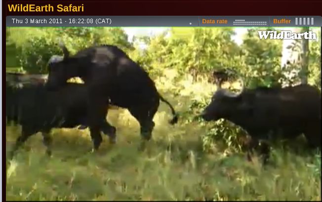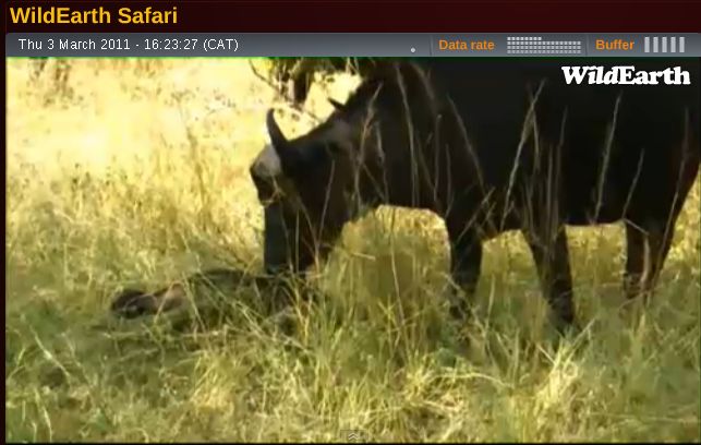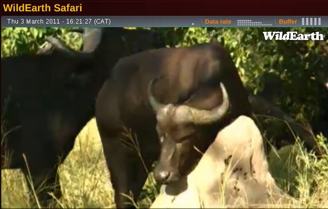 Während des Sonnenaufgangs der noch nicht den Himmel verfärbte, ging die Morgen Safari nach Westen um nach den Löwen zu suchen die einen Büffel nahe dem Gate getötet hatten. Ein wolkenloser Himmel wurde blau mit rosa Färbungen im Osten als ich vor Ort ankam an dem die Katzen den alten Büffel erlegt haben, direkt neben der Straße; Der Geruch des Opfers hing noch in der Luft. Da war ein großer Fleck von flachgetretenem Gras wo es passiert sein muss, übersät mit Innereien und Mageninhalt die auf das Drama hinwiesen. Der Kadaver war weiter in den Busch gezogen worden und alles was ich sehen konnte war die Spitze eines der gewellten Hörner und keine Katze in Sicht.