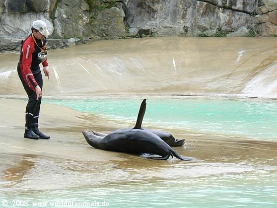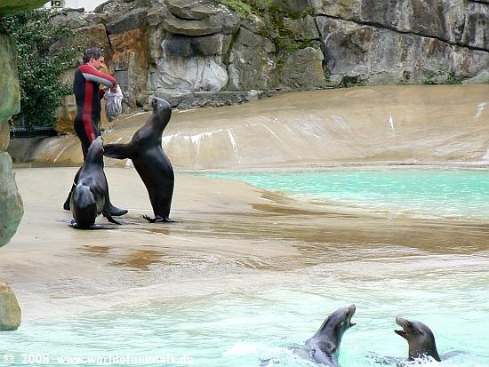 Es macht Spaß mit anzusehen, wieviel Freude die Tiere in diesen ca. 15 Minuten haben. Sie sind außer Rand und Band und führen kleine einfache Kunststücke vor. Der Pfleger begibt sich ebenfalls ins Wasser, erklärt zunächst einiges Wissenswerte über die Tierart und dann beginnt ein kleines Programm. Es ist ein Highlight im Zoo.