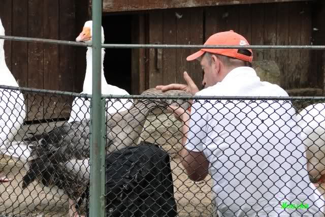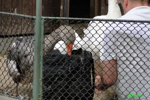 Nicht nur Knut hat seine Fans. Bei den Gänsen gibt es einen Stammbesucher, der des Öfteren stundenlang mit den Gänsen zusammen sitzt. Sie schnattern schon aufgeregt, wenn sie ihn von Weitem sehen. Da vor dem Kinderzoo zurzeit eine Baustelle ist, sind die Tiere alle hinter Gittern. So setzte sich der Gänsefan einfach mit ins Gehege.