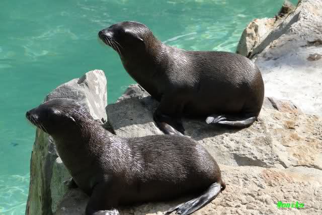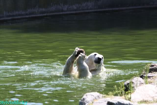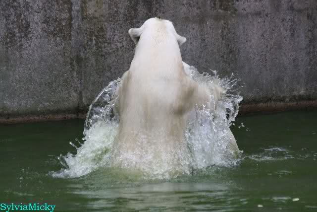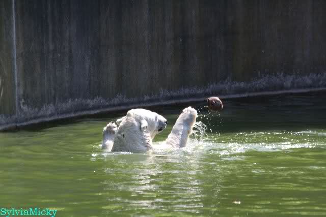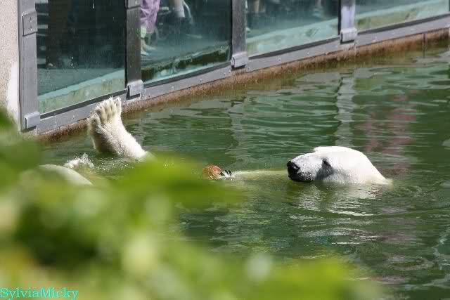 Dann bekamen sie Kokosnüsse. Sie spielten damit wie mit Bällen. Sie waren sie ins Wasser, sprangen hinter her oder warfen sie in die Luft, um sie wieder aufzufangen. Es war herrlich mit anzusehen. Dadurch standen auch viele Besucher an der Anlage. Menschen finden es viel besser, spielende Tiere zu sehen, als dröge auf der Anlage liegende.