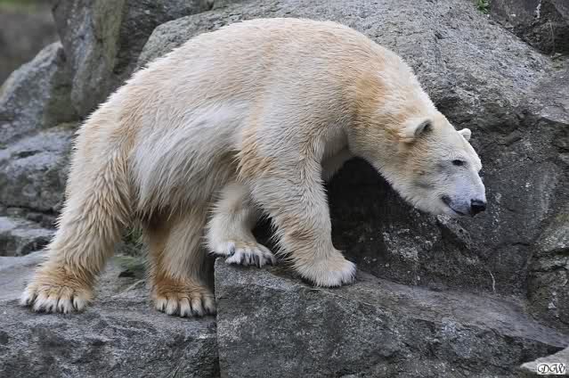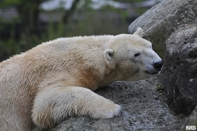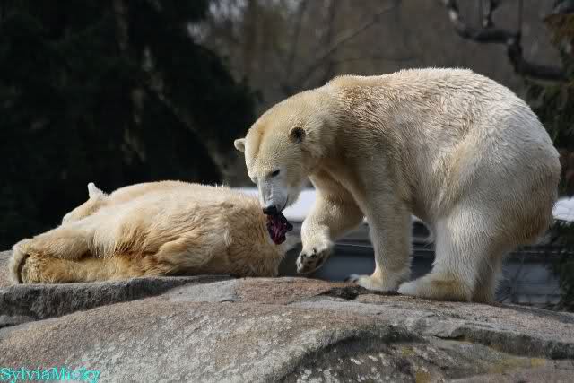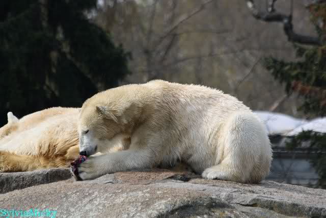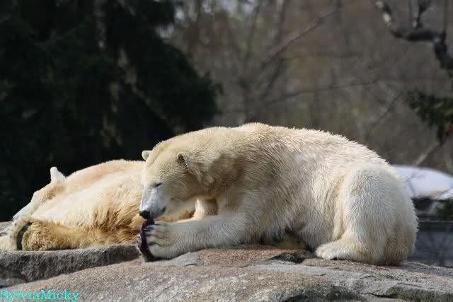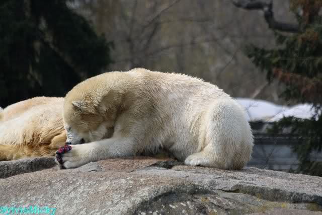Bilder noch von gestern. Eine von den nicht spielenden Eisbären beschäftigte sich mit etwas. Soll eine Wollmütze gewesen sein.