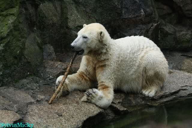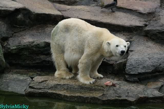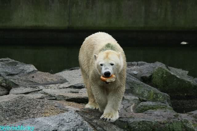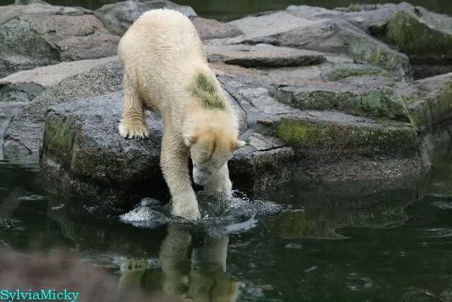 Wie mir eine Knutfreundin erzählte war Knut heute früh an der Scheibe. Kati ging ins Wasser und Tosca hinter. Als Knut Kati sah, ging er in die rechte Ecke. Da war er auch als ich um halb zehn im Zoo war.