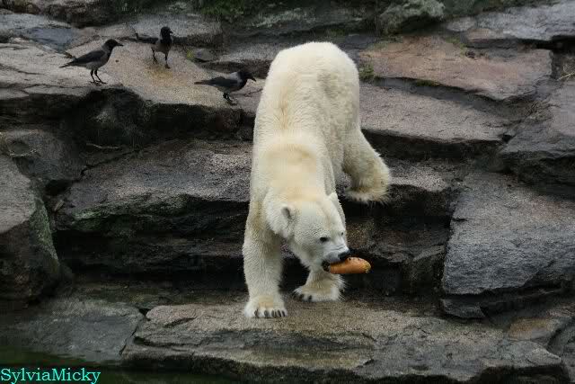 Aber Knut kletterte den Felsen hinauf und wanderte vorn zum Ufer. Sofort wanderten alle Besucher mit, natürlich vor der Anlage.