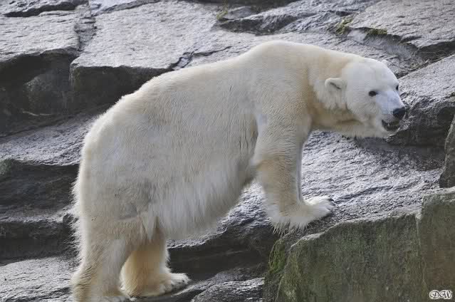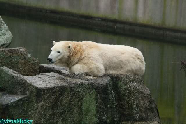 Kurz nach zehn traf ich am Eisbärengehege ein. Bei den Eisbären war Ruhe angesagt. Knut döste in seiner üblichen Ecke. Nancy saß auf der Ecke von Knuts „Balkon“ und ließ ihn nicht aus den Augen. Ganz so, als ob sie sein persönlicher Bodyguard sei.