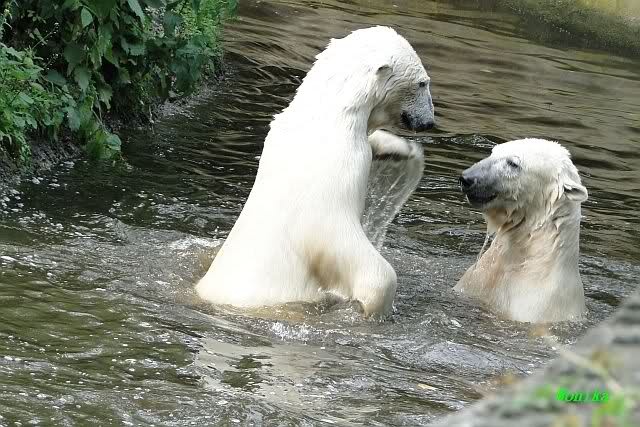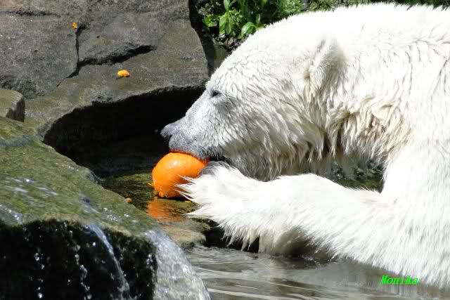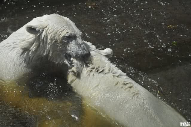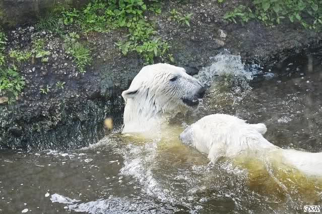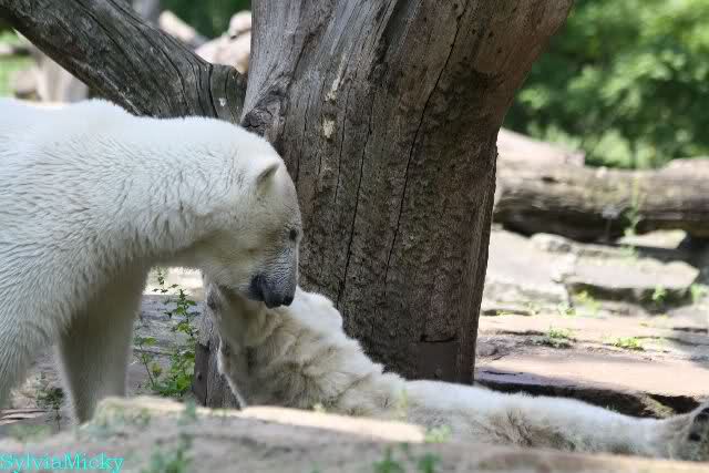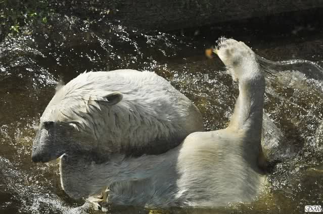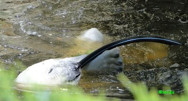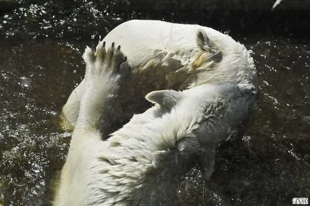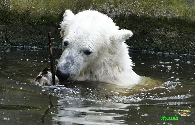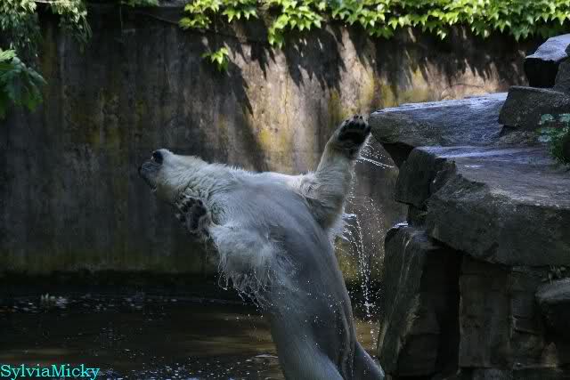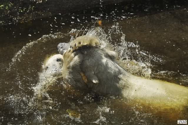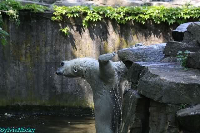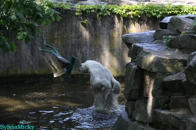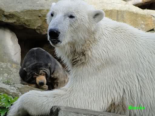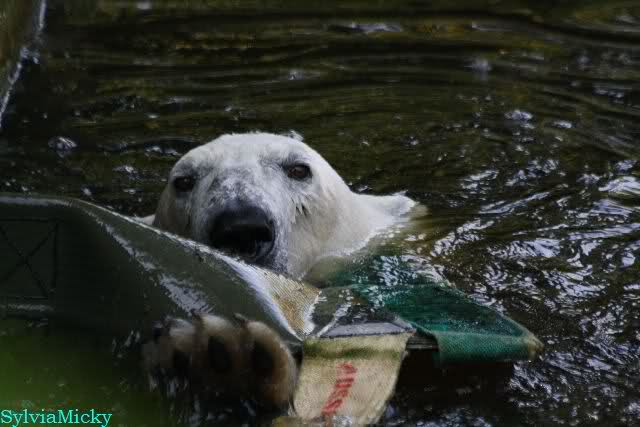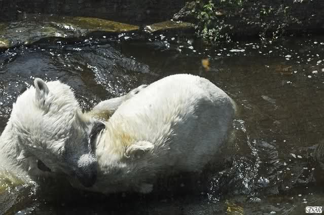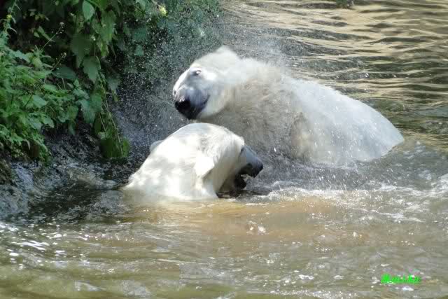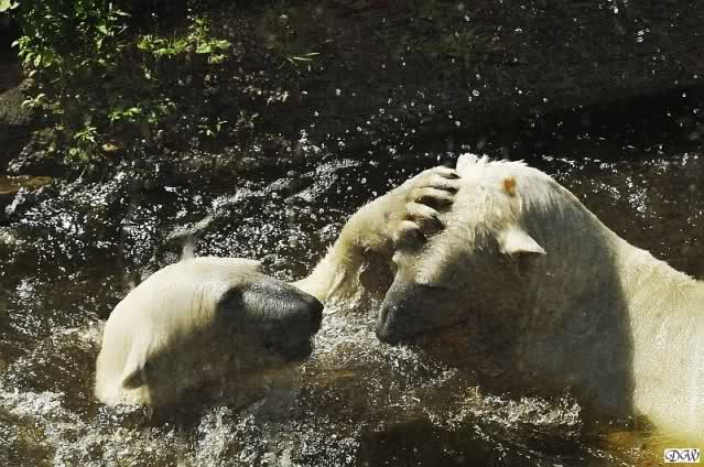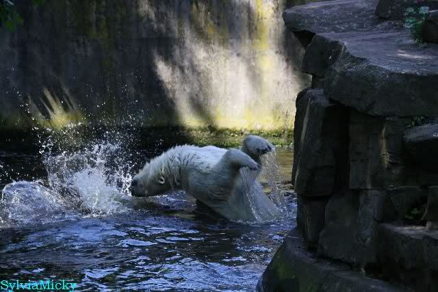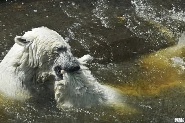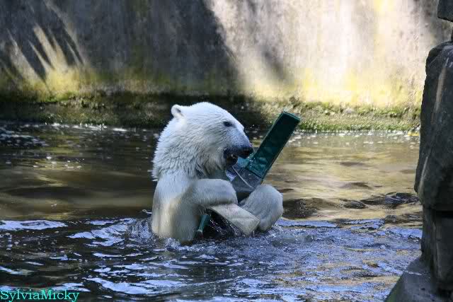 Monika, tolles Bild von Bumi in Knut's Arm. Natürlich habt Ihr Unrecht mit den weißen Bären. Dass sie sich wie wild waschen, könnt Ihr an der dunklen Farbe des Wassers erkennen