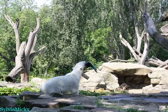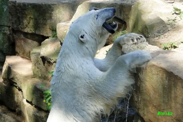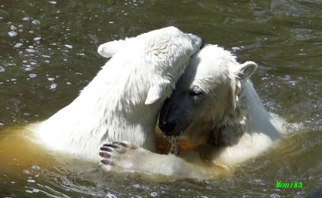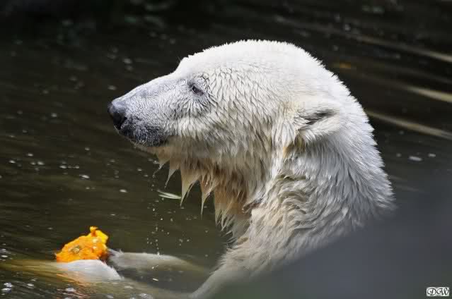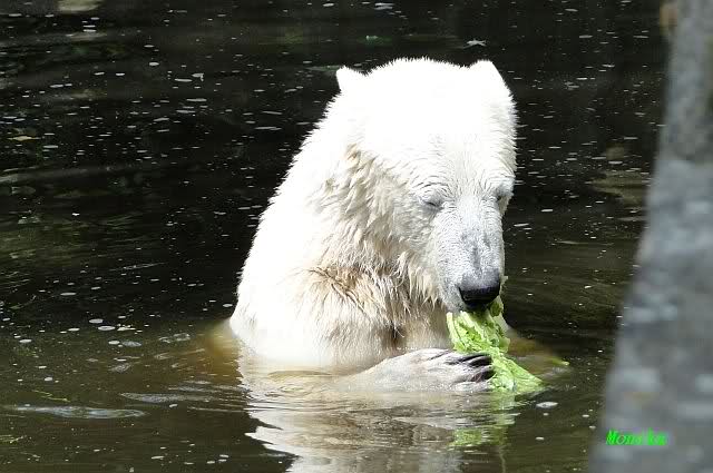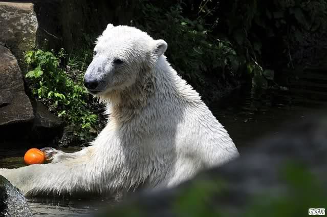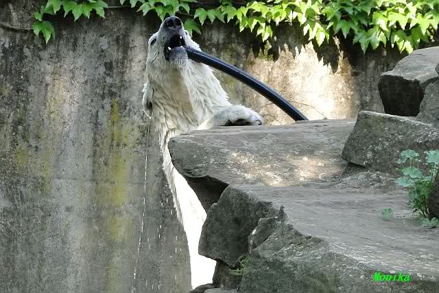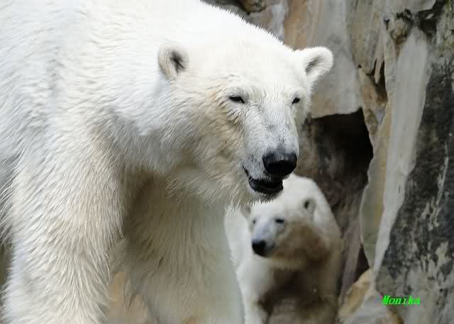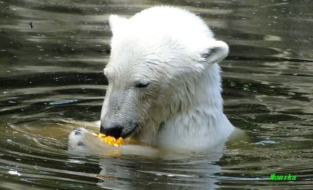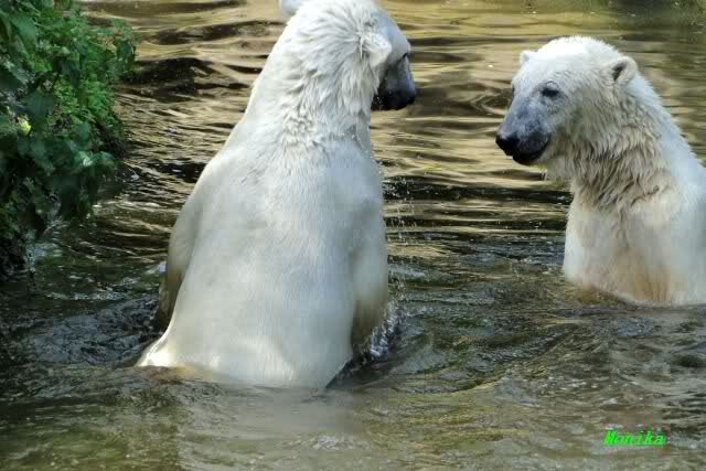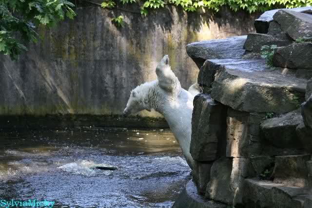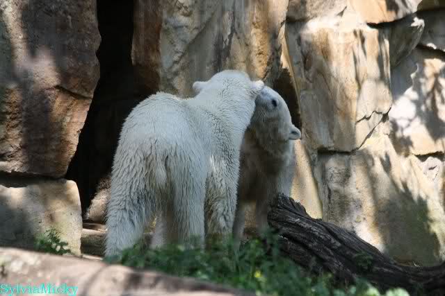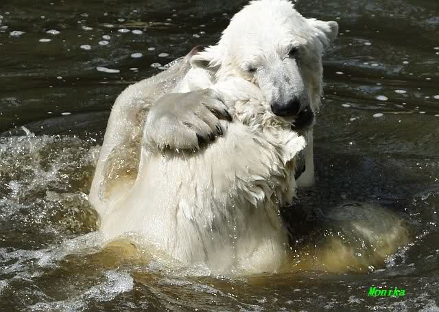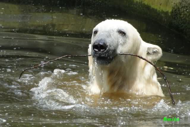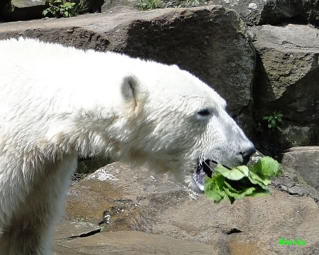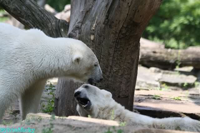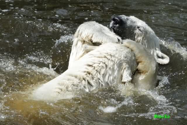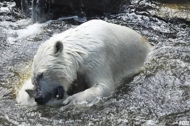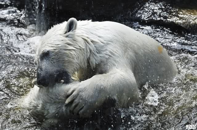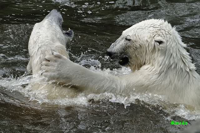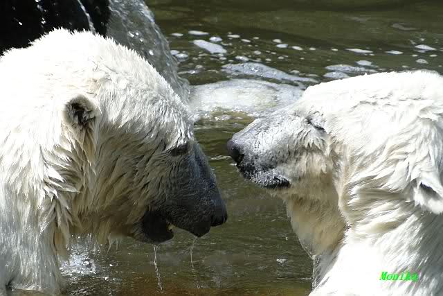 Monika, tolles Bild von Bumi in Knut's Arm. Natürlich habt Ihr Unrecht mit den weißen Bären. Dass sie sich wie wild waschen, könnt Ihr an der dunklen Farbe des Wassers erkennen