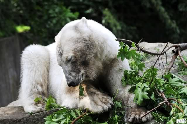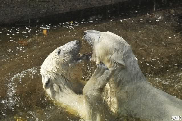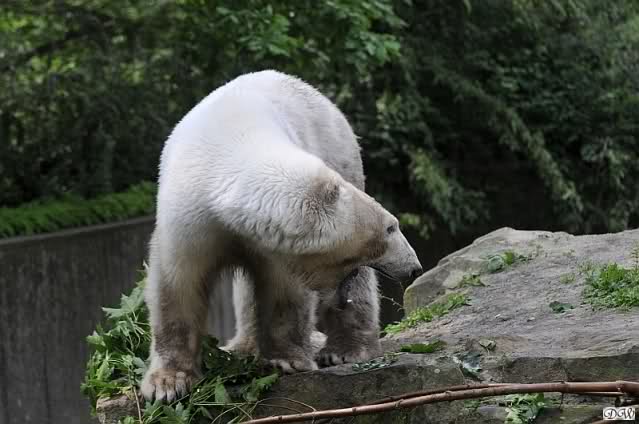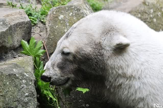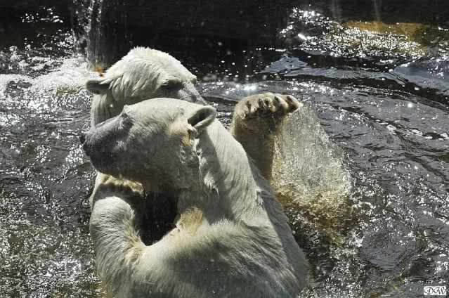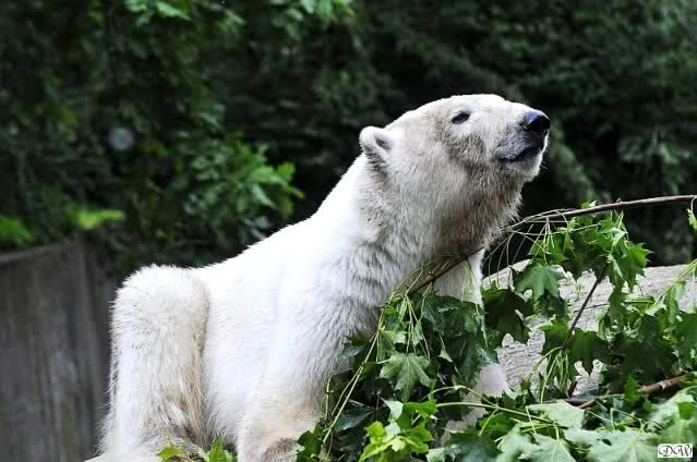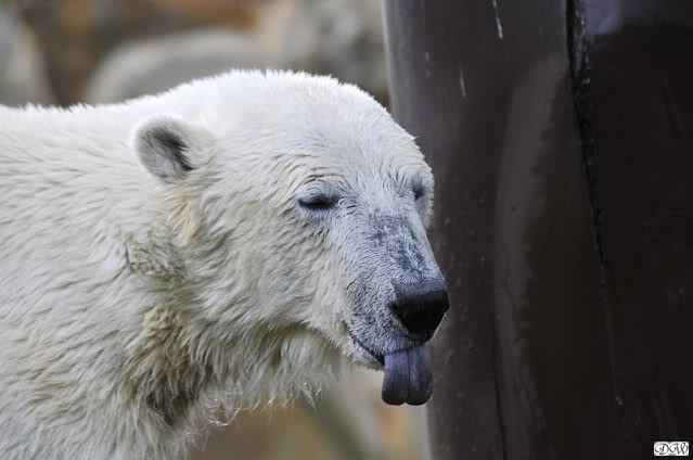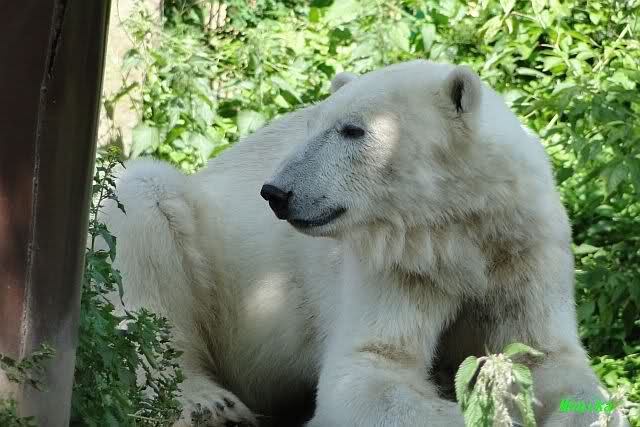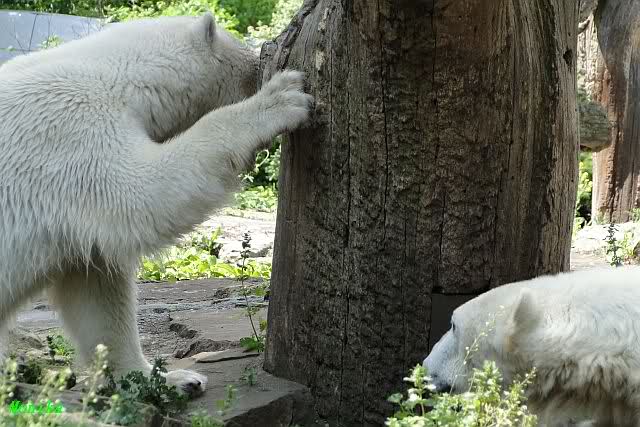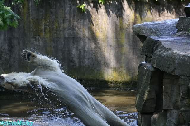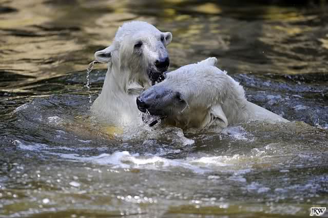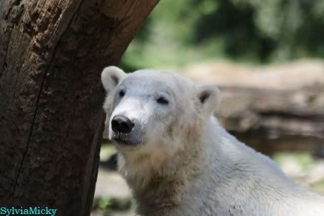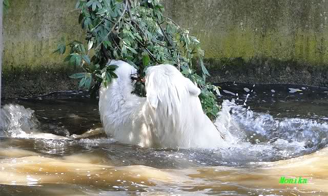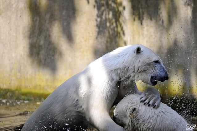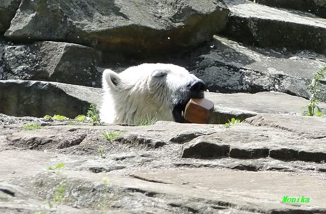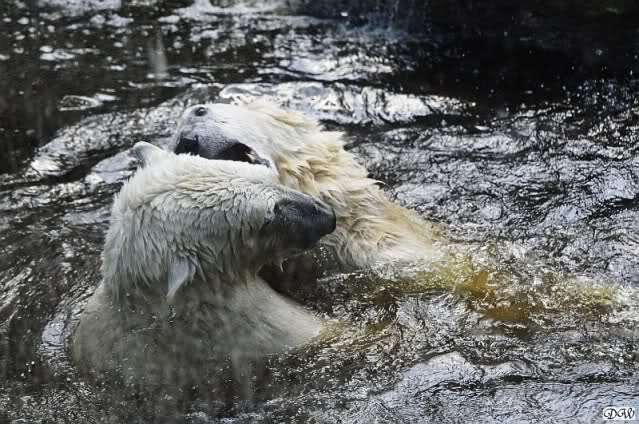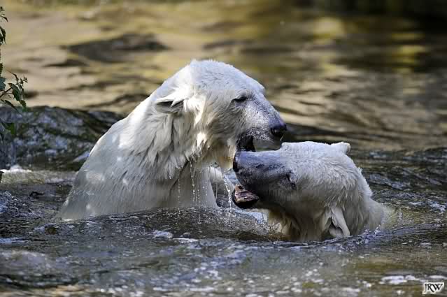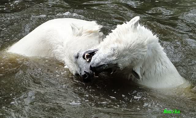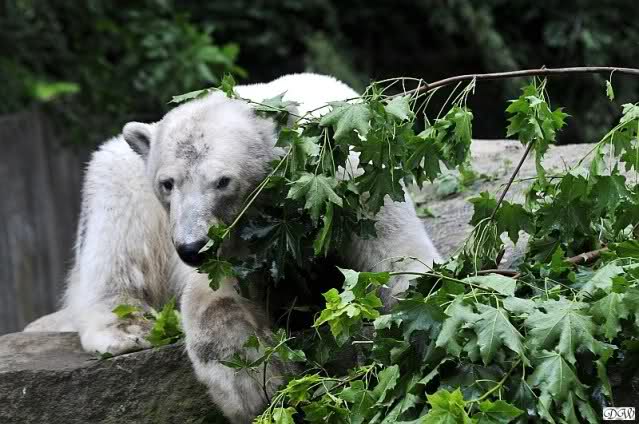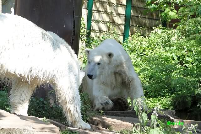 Monika, tolles Bild von Bumi in Knut's Arm. Natürlich habt Ihr Unrecht mit den weißen Bären. Dass sie sich wie wild waschen, könnt Ihr an der dunklen Farbe des Wassers erkennen