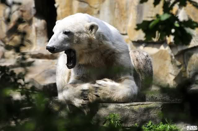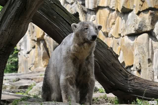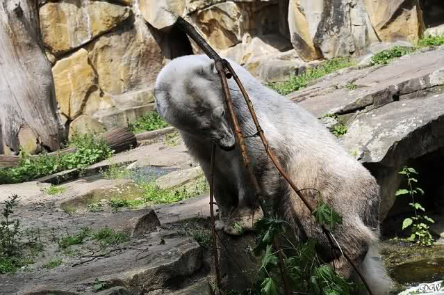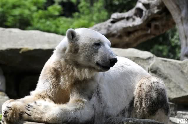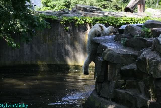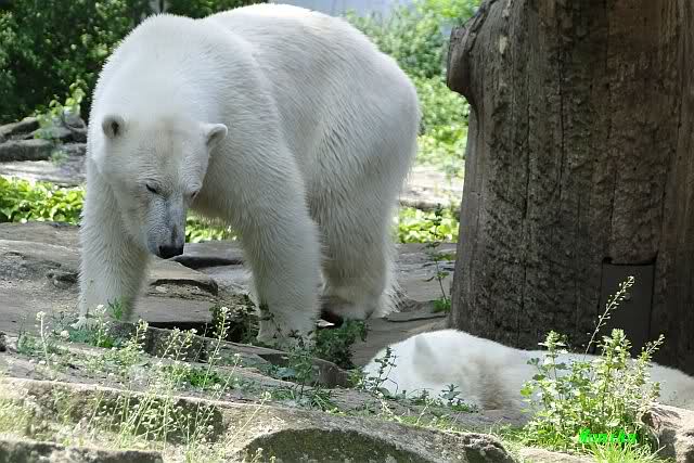 Wir kamen heute nach unendlichen Staus um 09.50 im Zoo an. Viele der Anwesenden fingen an zu lachen und sagten, dass Knut und Gianna um 09.45 aufgehört hatten im Wasser zu toben. Knut lag nun in seiner Kuhle und schlief. Er hob kurz den Kopf und der war schon schwarz! Gianna lief auf der Anlage umher.