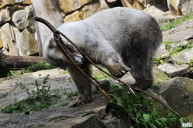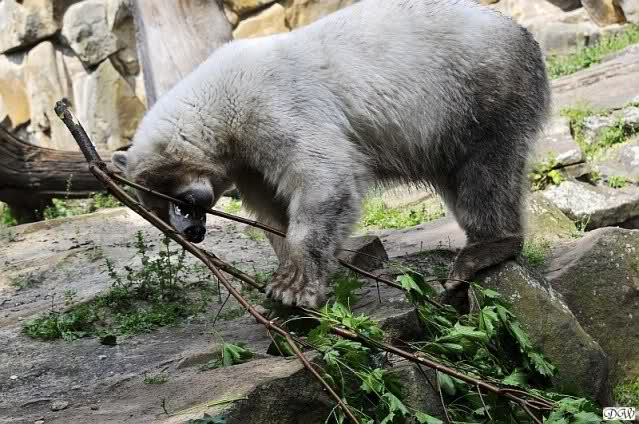 Herr Henkel kam und brachte Zweige für die Braunbären und auch für Knut und Gianna. Nachdem Knut von Herrn Henkel gerufen wurde, stand er kurz auf um zu sehen, was es Neues gab. Gianna kam angerannt und machte die tollsten Verrenkungen um an die Zweige zu kommen. In ihrer Ahnentafel ist garantiert eine Schneeziege zu finden. Knut dachte sich wohl, Gianna solle sich doch verausgaben, er schlief lieber weiter. Erst später hatte er sehr viel Spaß mit dem Grün.