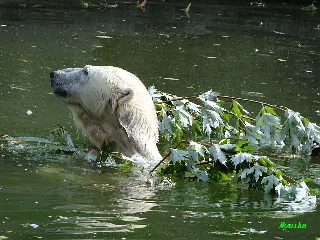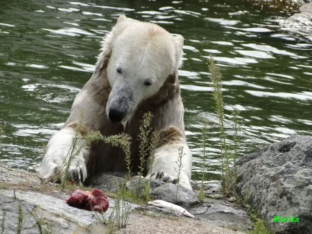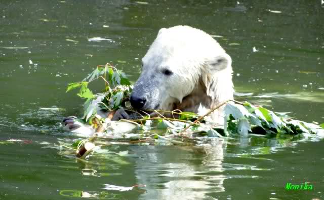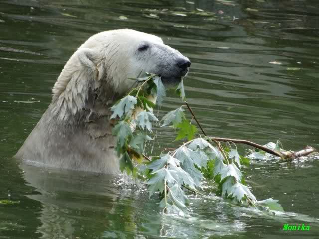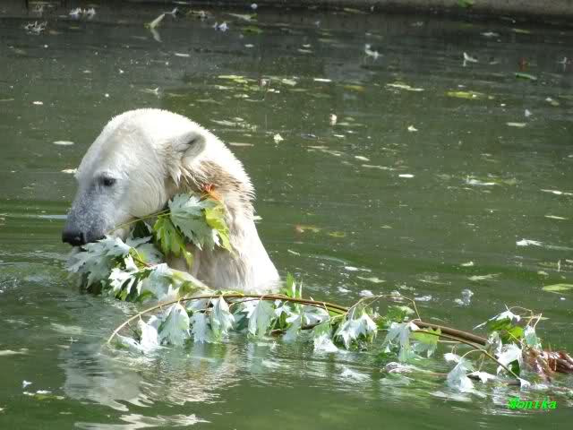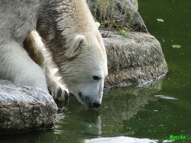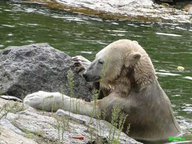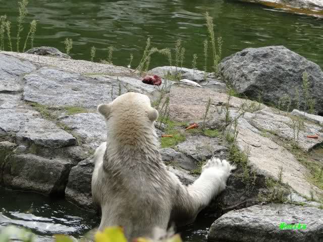 Vielen Dank an Monika für die Fotos von Knut und dass Ihr Euch in Berlin so rührend um den Eisbären kümmert. Als der Pfleger damals von heute auf morgen starb, war das für Knut sicherlich eine Traumatisierung. Er lief im Gehege auf und ab und hielt ständig Ausschau nach dem Pfleger. Eine Eisbärenmutter hatte er ebenfalls nicht. Dem Junge fehlt bestimmt eine ordentliche Portion Substanz. In der Arktis wäre er lebensunfähig. Mit Gianna wurde der fehlende Körperkontakt, den er als Eisbärenbaby nicht bekam, etwas ausgeglichen. Dann ging Gianna von heute auf morgen. Ich höre zwar desöfteren, dass ihm Gianna nicht fehlt und dass er den Verlust gut wegsteckte. Bin mir da aber aufgrund der Vergangenheitserlebnisse nicht so sicher. Ich beobachte, dass Raubtiere hochempfindsam sind. Beim Tiger beobachte ich, dass sie genau merken, wenn ein provokativer Mensch vor ihnen steht. Die Ausstrahlung, die Schwingung, das kommt rüber. Es wurde beobachtet, dass Pferde beim Schlachttransport Tränen hatten. Käme Knut in einen anderen Zoo, hätte er sicherlich dieses Angstzittern auch. Hoffentlich klappt das dort in den nächsten Wochen. Ein bisschen Vertrauen ins Leben und in die Pfleger habe ich schon, obwohl ich Nationalparks vorziehe. Ich bin zwar nur ein Laie, mache jedoch so meine Beobachtungen mit Tieren. Es wird bestimmt gut gehen, das hoffe ich.