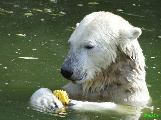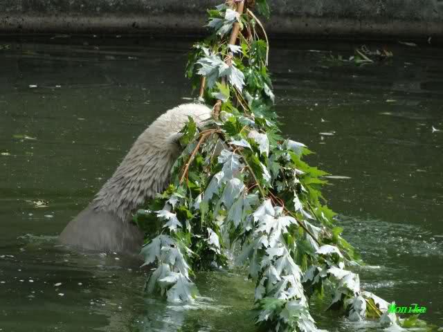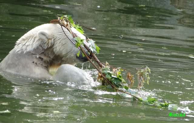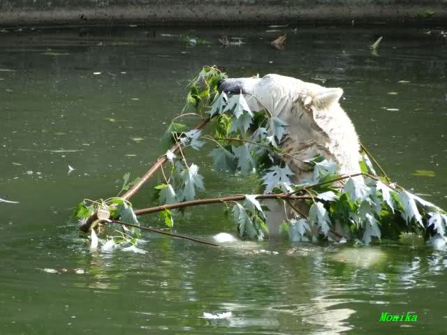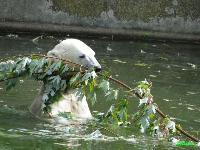 The events of the morning have already been described in full detail. At about 13.30 h, Knut went slowly –as if he was walking on ice – towards the water and drank quite a lot. Shortly thereafter, he went into the water and started to swim around in the entire pool, sniffing at Lars’ former isle and Tosca’s one. He also came to the glass shield for a short while. Although the keepers first worried about the fact that so far he did not eat, they were nicely surprised to find him already in the water. And so, the grapes wee the first that came flying. Knut was a bit helpless and did not know quite exactly where to eat them. Well, obviously, he is no longer having a kitchen table and so, he was eating them in the water. Then fishes, meat and the other stuff followed their way in the water and a lot of food was thrown on Lars’ isle. Nevertheless, Knut could not or dare not enter the isle and he was sitting beside it and tried to fish the food, maybe hoping that the food would come swimming. But alas, it did not help. Again and again, he tried to climb the isle and fished for the leftovers (and there a still some on it). After lunch, Knuti continued his swimming. And then Mrs. Weckert arrived with two big twigs and throw them into the water. First, Knuti looked at them, but shortly thereafter started to play (just as he was used to do before). We were all so relieved. Shortly thereafter, things changed a little. Knuti was on Tosca’s isle and trembled over his entire body. An this took quite a while. When he then finally found the courage to jump into the water, everything went better again. He played a little with the twigs and continued his swimming. It goes without saying that I would have wished to stay longer, but after 7.50 hours my feet started to protest.