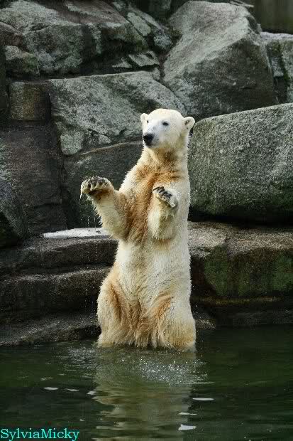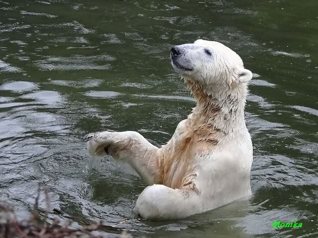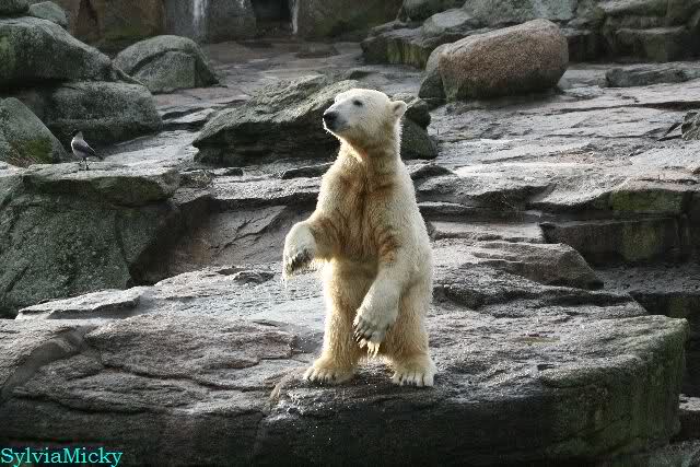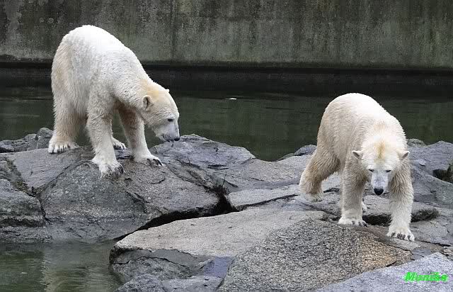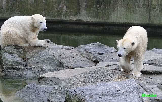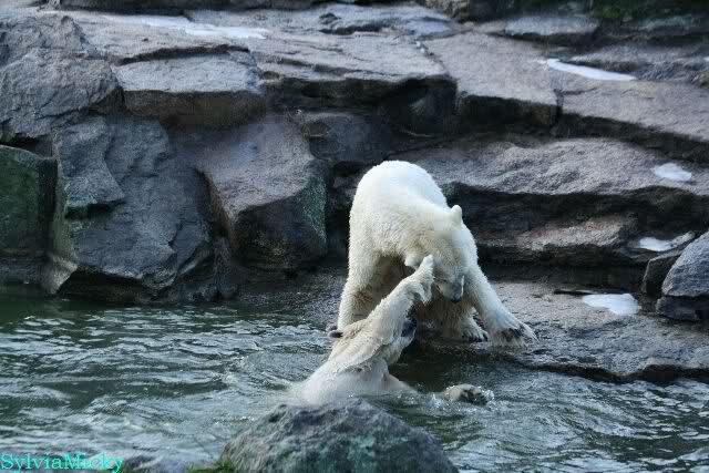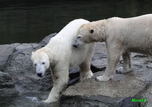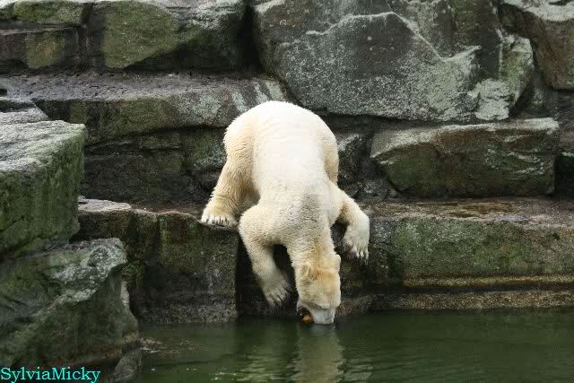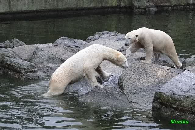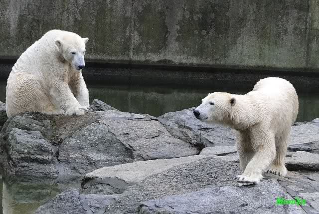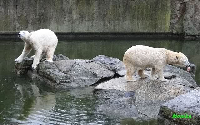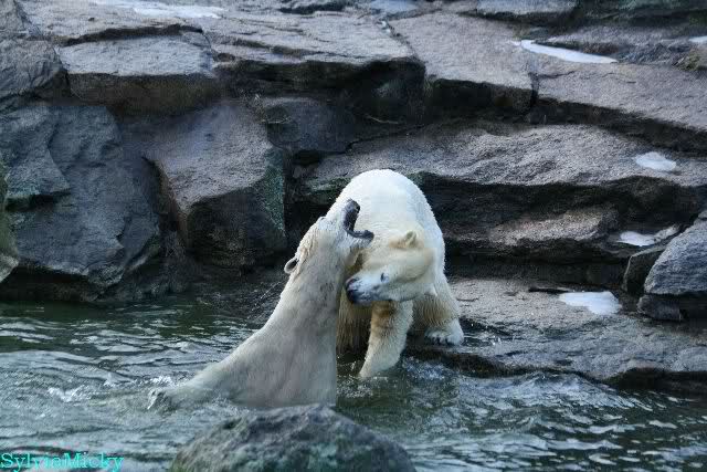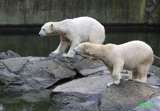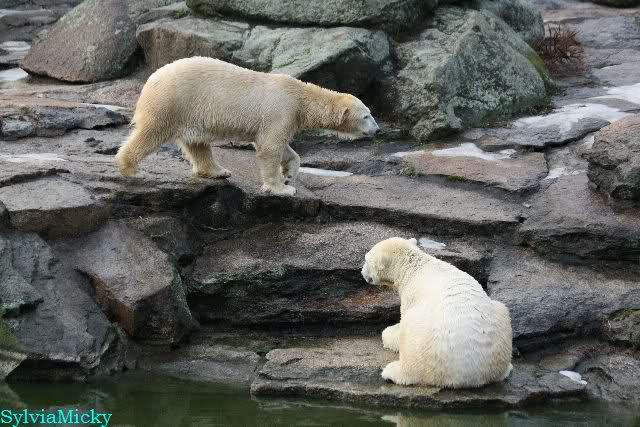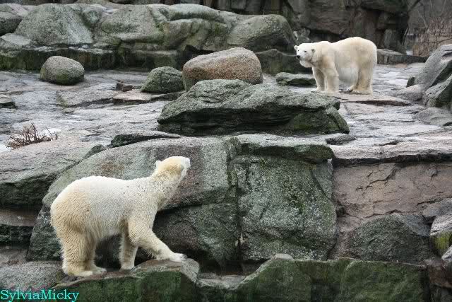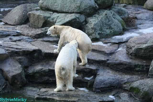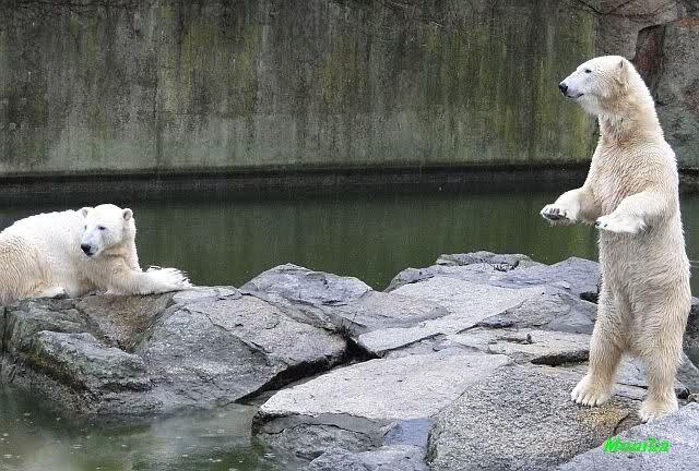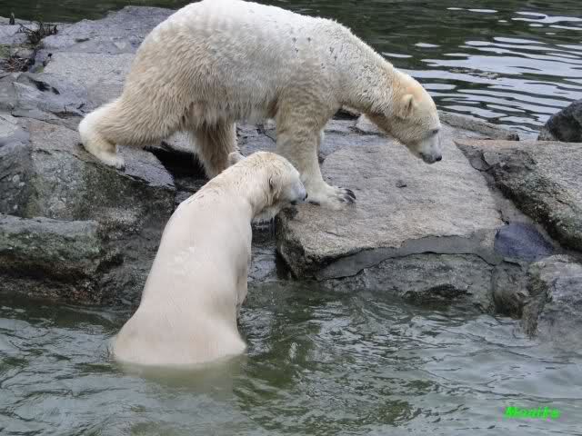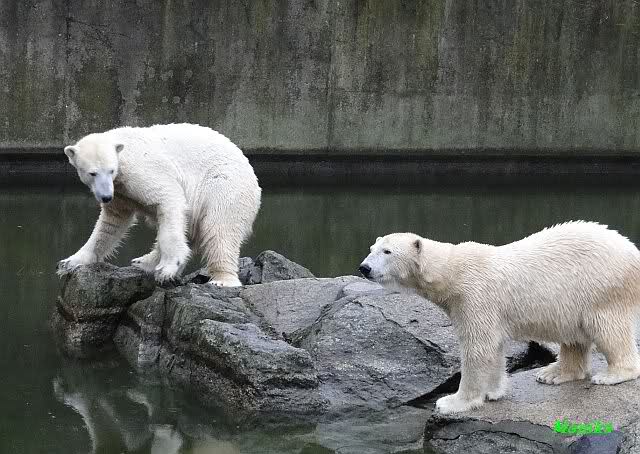 Früh spielten Knut und Tosca im Wasser. Als ich kam, war Tosca im Wasser und Knut stand vor ihr auf der Anlage. Sie schmusten miteinander. Tosca kam dann raus und Knut legte sich vorne auf die Anlage! Tosca lief hinter ihm immer hin und her. Er blieb aber liegen. Zur Fütterung war er auf der rechten Seite, ging aber auf das Plateau und ließ sich dort füttern! Wieder ein Schritt für ihn.