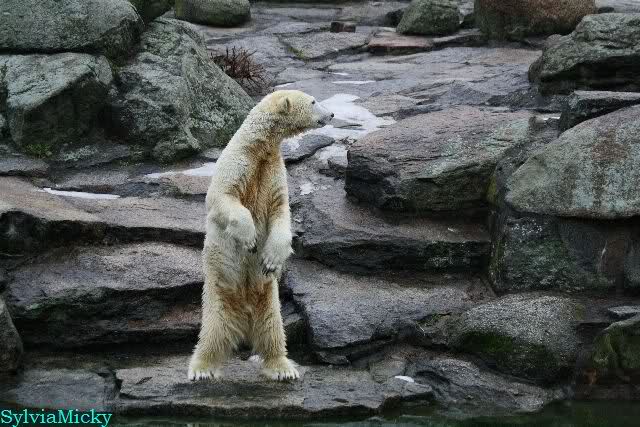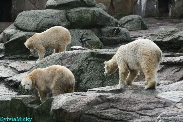 Aber irgendetwas weckte sie und sie bewegte sich. Knut ging dann doch lieber übers Plateau in seine Ecke. Er lief nochmals zum Plateau, sah aber Kati, die inzwischen wach war und beschloß wieder in seine Ecke zu gehen. Er stellte sich dann an den Felsen hoch, sah aber die Bärinnen und legte sich dann auf seine Ecke und döste.
