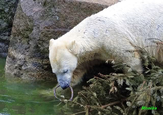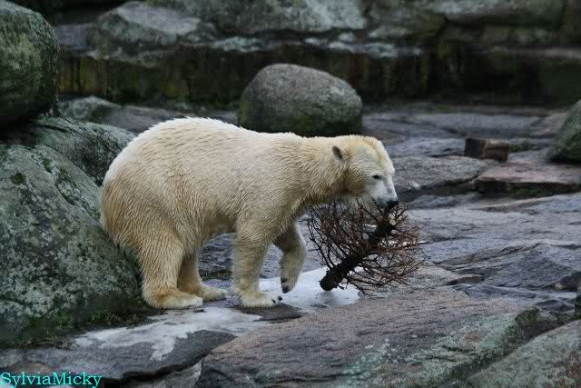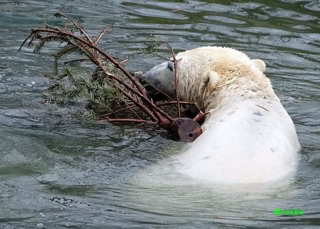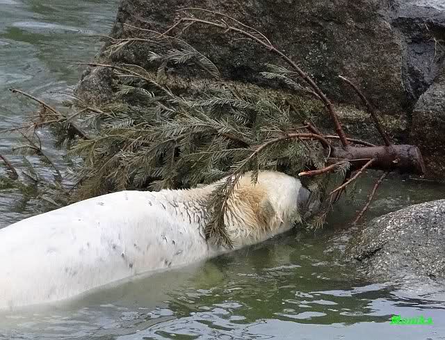 Knut spielte mit dem Weihnachtsbaum, verschiedenen Tüchern mit Restbällen und dem kleinen grünen Ball. Aber er schaute immer wieder zu Tosca. Als sie nicht spielen wollte, schwamm er zur Scheibe und zeigte den Rest vom Lederball. Es waren heute, auf Grund des sonnigen Wetters, viele Besucher im Zoo.