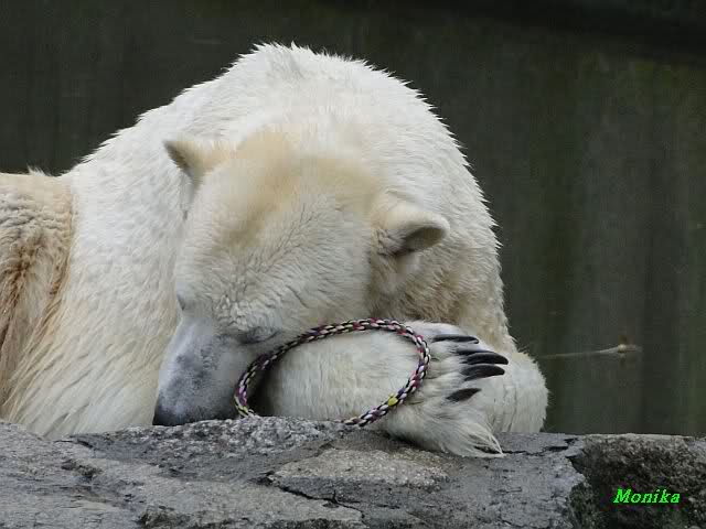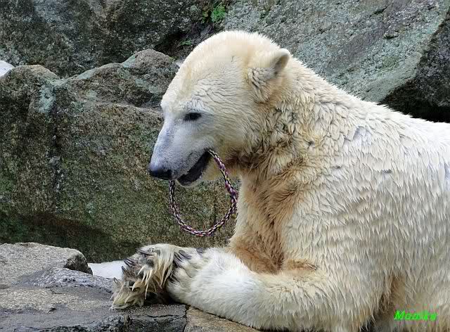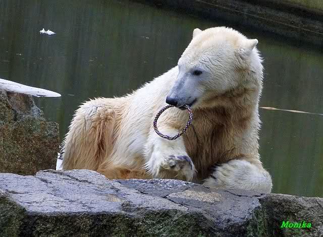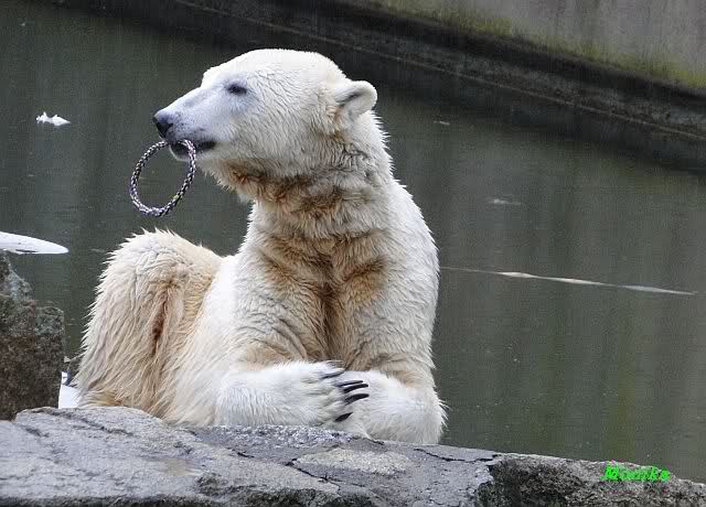 Nach der Fütterung schwamm er im Wasser und fand noch mehrere Stücke Fleisch. Tosca nahm sich den ollen Baum und ging mit dem Baum auf den Felsen zu Nancy. Kati lag am unteren Ende des Felsens.
