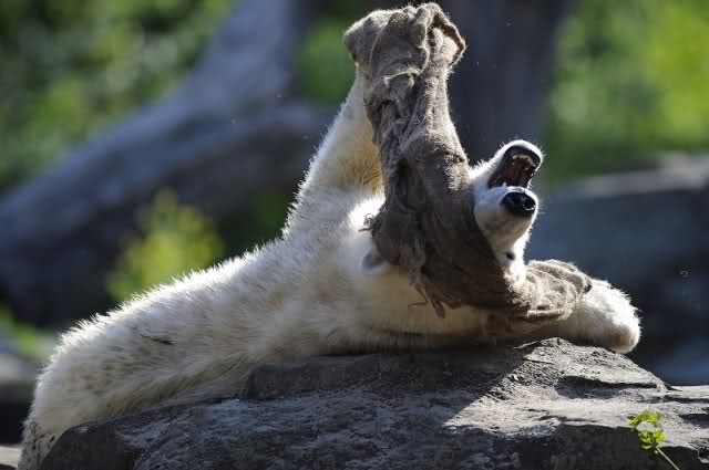 Ich war heute sehr früh am Zoo, so dass ich auf Einlaß warten musste. Als ich dann hinein durfte, ging ich zuerst zu Knut. Weil der aber gerade döste, drehte ich zum Seele-Baumeln-lassen die große Bärenrunde. Bei den Eisbären war zu so früher Stunde Putzen angesagt. Die Bären waren nicht zu sehen. Dafür aber Herr Röbke, der mit einem Wasserschlauch gründlich die Anlage reinigte. Die Malaien waren wohl noch verschlafen, sie dösten oben auf den Steinen.