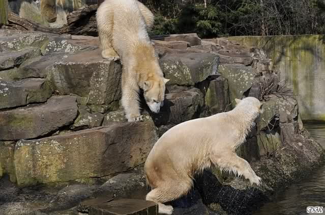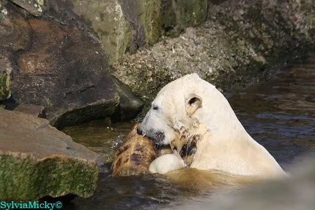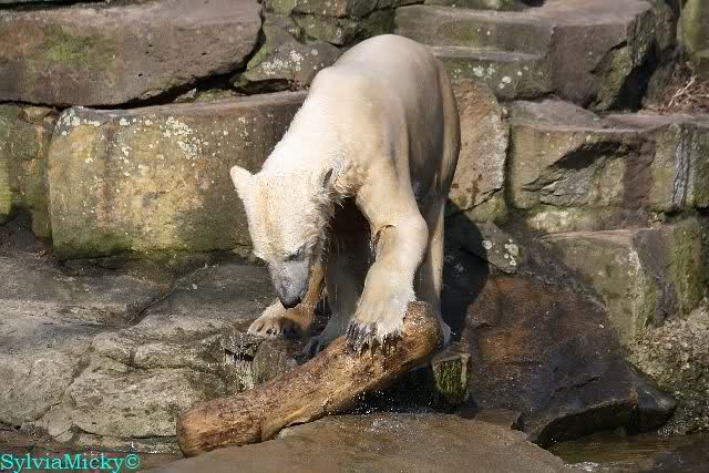 Knut und Gianna waren ebenfalls mobiler als in den letzten Tagen. Sie spielten abwechselnd mit den verschiedensten Dingen im Wasser. Mal war es Knut, dann wieder Gianna. Keiner ließ den anderen richtig aus den Augen. Immer wieder kam es zu Begegnungen der Beiden ohne jedoch das ausgelassene Spiel der vergangenen Wochen zu zeigen. Knut fängt seit ca. einer Woche sehr früh an zu laufen. Gegen 12.00 Uhr scheint sein Magen zu knurren. Selbst nachmittags ab spätestens 15.00 Uhr läuft er wieder, ab und zu unterbrochen von kleinen Schnäbeleien.