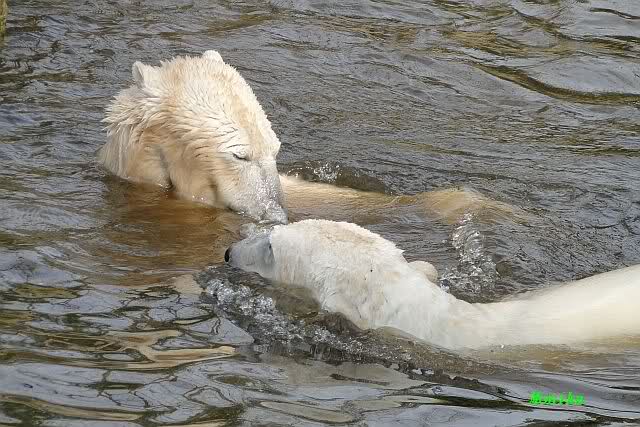 Heute Morgen lag Knut auf dem "Sandhaufen" und buddelte . Das fand Gianna natürlich interessant und ging gucken was er da so macht. Schon waren beide munter und es wurde geschmust. Knut ging dann ins Wasser und schwamm ruhig seine Bahnen, wie ein U-Boot. Gianna kam ab und zu runter und sucht Kontakt. Irgendwann ging sie dann auch ins Wasser und sie tobten gemeinsam. Kurzes Tauziehen mit dem Nackthuhn gab es auch.