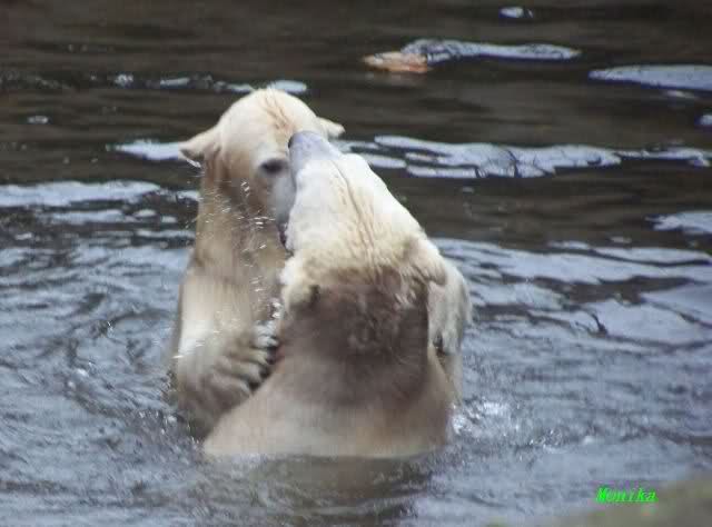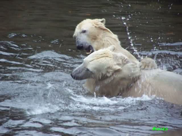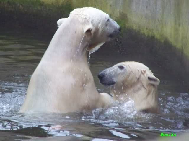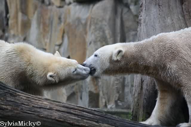 Wieder ein weiterer Schritt für Knut und Gianna. Als ich heute Morgen um 9.00 im Zoo ankam, spielten die Beiden bereits miteinander im Wasser. Gianna sprang auf Knut und tauchte ihn unter Wasser, aber auch umgekehrt. Sie tollten ausgelassen noch 1/2 Stunde. Anschließend wurde auf der Anlage auch noch ab und zu gebusselt, und Knut zwickte Gianna öfters in den Po.