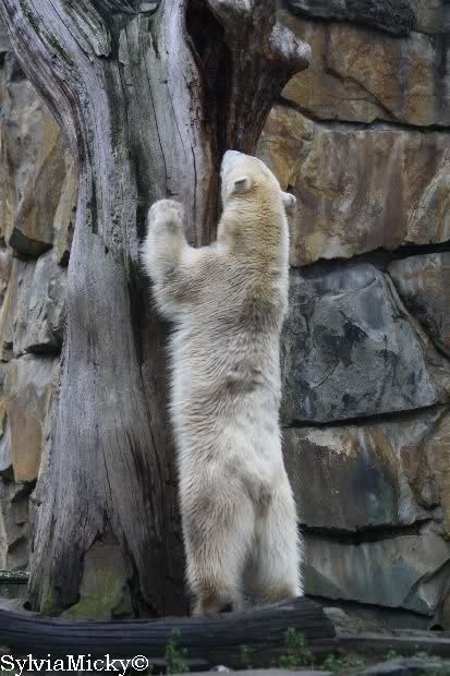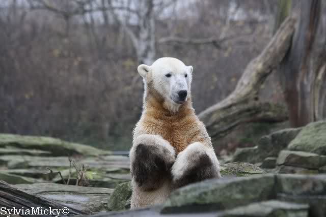 Aber auch ich bekam noch allerlei Schönes von Knut und Gianna geboten. Knut machte schöne Posen um Gianna zu beeindrucken. Er stellte sich auf die Hinterbeine und reckte den Hals, als wolle er sagen: „Guck doch mal, Gianna, bin ich nicht ein schöner Bärenjunge?“