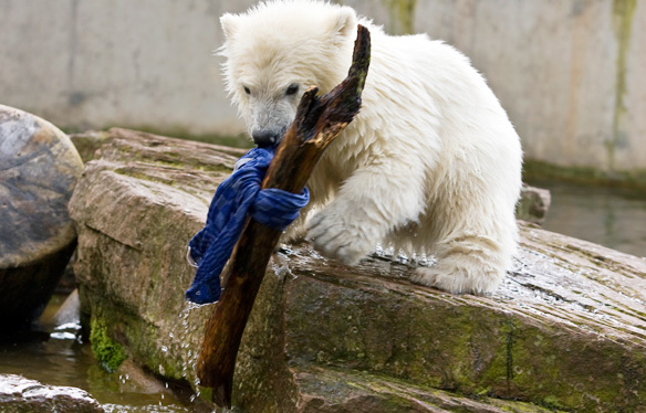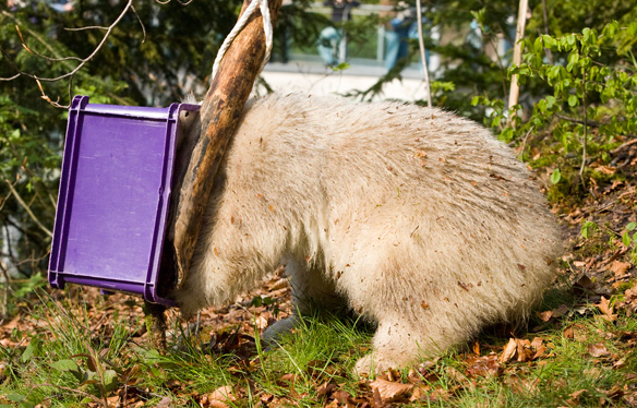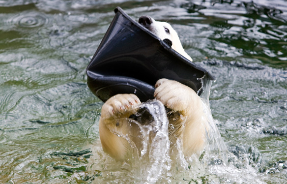 Flocke hat wirklich viel zu tun. Ständig werfen die Pfleger irgendwelche interessanten Sachen ins Wasser. Ob Eimer, Bälle oder dicke Äste – alles wird an Land gezerrt und gründlich untersucht. (Foto: Ralf Schedlbauer)