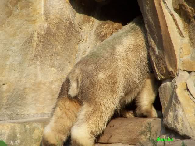 Der Höhleneingang stand zwar heute den ganzen Tag offen, aber Knut traute sich nicht hinein. Er ging zwar immer wieder zur Höhle und schnupperte. Machte dann aber wieder einen Rückzieher. Ins Wasser sprang er nur einmal von seinem Sandberg aus, als er Angst bekommen hatte und nicht wußte wo er hin soll. Gespielt hat er heute nicht. Die Bauarbeiten sollen aber Morgen beendet sein. Hoffentlich.