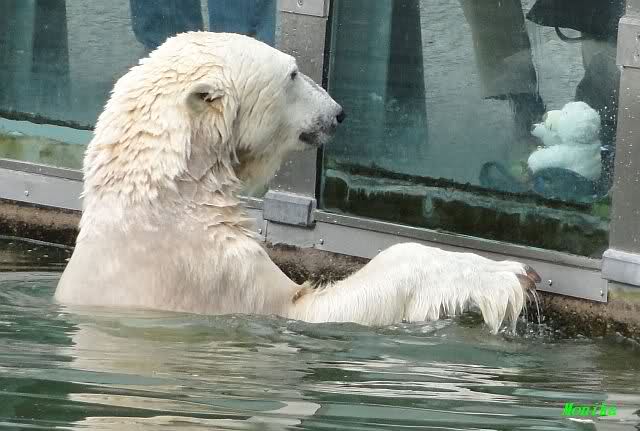Ein nettes Ehepaar aus Hessen hatte kleine Eisbären in der Tasche. Sie stellten die Tasche an der Scheibe ab und Knut versuchte mit der Pfote die Eisbären zu erreichen. Er ist noch sehr verspielt, deshalb wäre es so wichtig ihm seine Spielzeuge zu geben. Es wäre etwas Vertrautes.