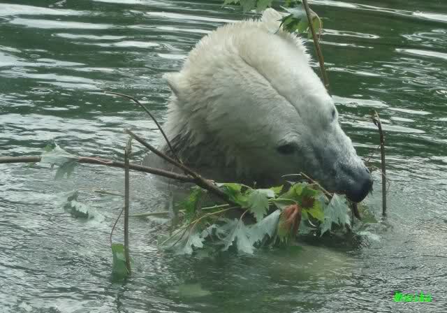 Knut arrived only at about 9.30 h at the enclosure because of cleaning works. He left his cage rather quickly but is still walking very carefully over the rocks (but apparently no longer like “walking on ice”). Of course, everything needed to be checked and re-checked again. According to Sylvia, a sand heap will help him to feel more comfortable (my personal comment: I agree, and if not sand, then maybe wood chips). Thereafter, he has been playing for about 3 (!!) hours in the water, an element in which he is feeling very good. There, he also found the leftovers of a chewing bone that is looking like a piece of leather (of course, he is familiar with this stuff and its looks). There was also some playing with the big twig and efforts were made to catch branches. And also, a coconut was one of the found treasures. Then Mr. Henkel arrived and throw a big wood slice with which he has been playing quite a long time. He has also been swimming around the little islands, but did not climb on them. And of course, he came often to the glass shield, much to the great pleasure of his visitors. A wee girl said that he is still a baby who wants to play (personal note: as we say in Dutch: de waarheid is in de kindermond). A couple from Hessen were having little polar bears in their bag and placed them at the shield. Knuti tried to get them and according to Sylvia, it might help to give him some of his old toys, because they are known to him.