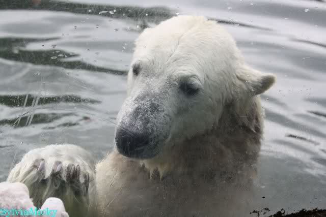 Was mir nicht gefällt, ist das es Besucher gibt, die mit Ringen oder anderen Gegenständen oder Händen an die Scheibe klopfen. Knut springt dann immer an der Scheibe hoch. Vielleicht wäre es der Zooleitung möglich zwei Schilder auf Deutsch und Englisch anzubringen. „Bitte nicht klopfen“