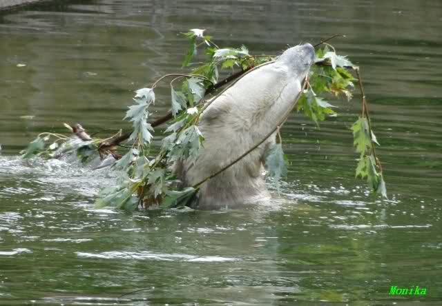 Er war am Vormittag über drei Stunden im Wasser. Er fühlt sich dort am sichersten, glaube ich. Er schwimmt auch um die Inseln rum aber geht nicht rauf.