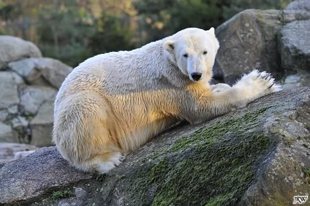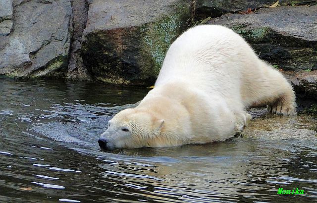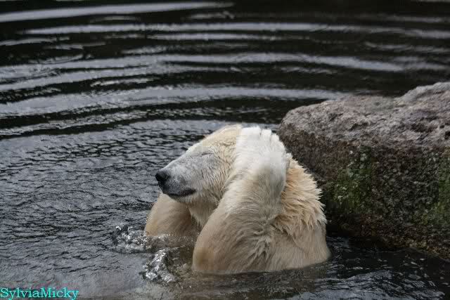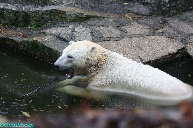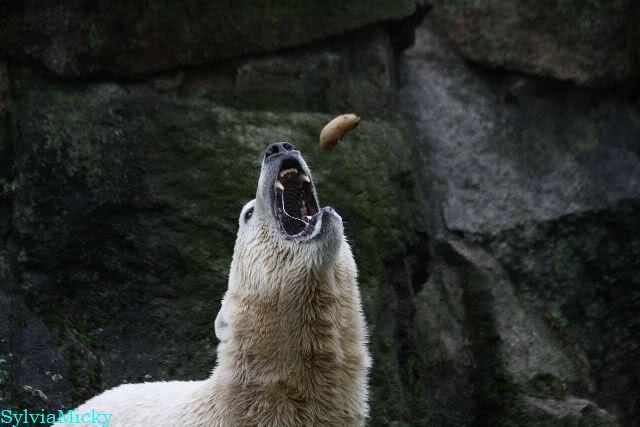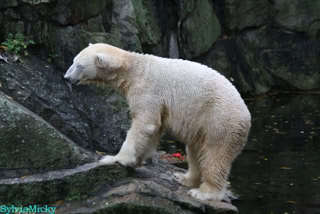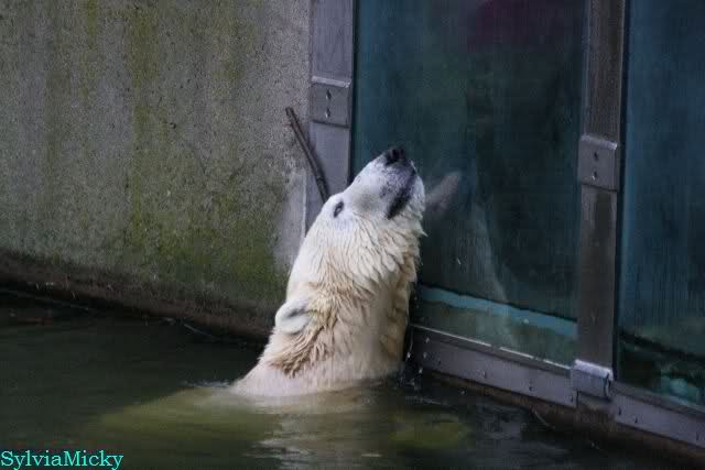 Gefüttert wurde er auf der hinteren rechten Seite. Knut hat etwas zugenommen. Kann aber noch einige Kilos zulegen. Nach der Fütterung wollte er mehrere Male auf die Anlage aber als er die Drei sah, ging er wieder runter und legte sich auf die hintere Ecke. Etwas später wollte er auf die vordere Ecke, da schwamm Tosca aber im Wasser. Also ging er wieder nach hinten.