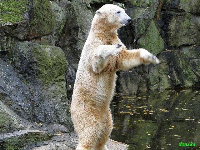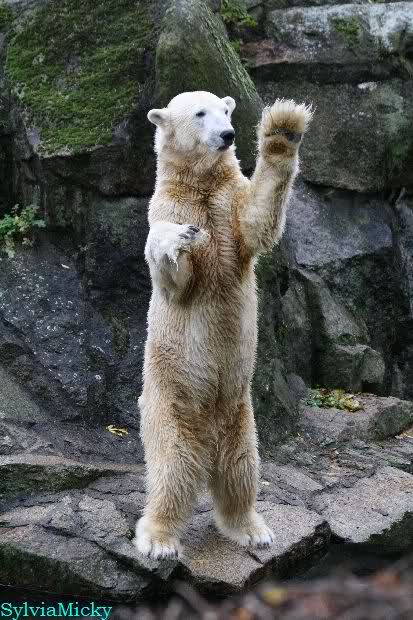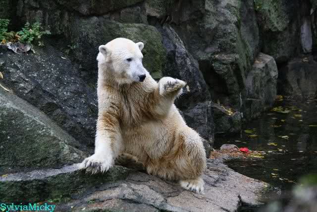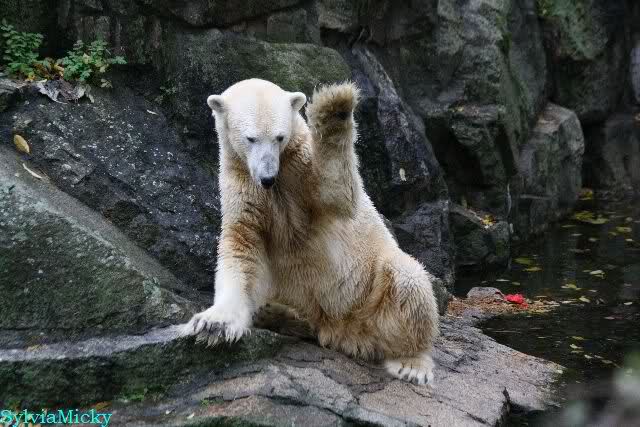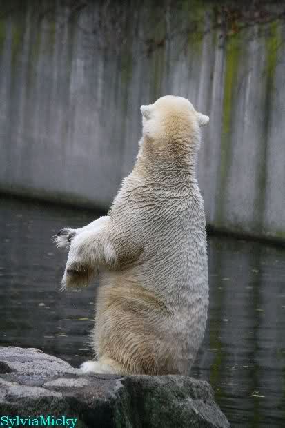 während Knut auf die Fütterung wartet, winkte er den Besuchern zu.