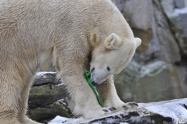 Knut hat Spaß mit dem grünen Teil, das inzwischen wie Geschenkband aussieht. Passend zu Weihnachten.