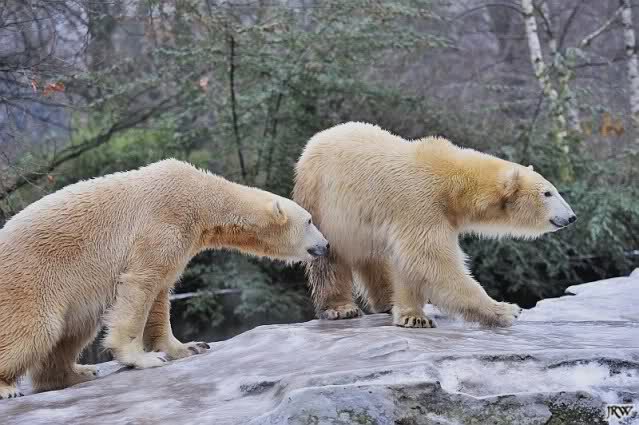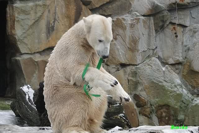Es war ein schöner Vormittag im Zoo mit vielen Knut-und Giannafreunden, bei Sekt, Plätzchen und Kaffee. Die beiden Bären waren in Hochstimmung. Es wurde viel geschmust und gespielt. Gianna kam mit einem neuen Jutesack auf die Anlage, der mit einer Hantel gefüllt war sowie einem Plastikteil mit 2 Bällen drin. Wie es nun mal Giannas Art ist, zerfetzte sie alles in Sekundenschnelle und warf die Reste ins Wasser. Sie tobten auch wieder ausgiebig im Wasser.