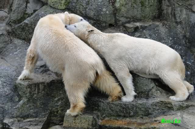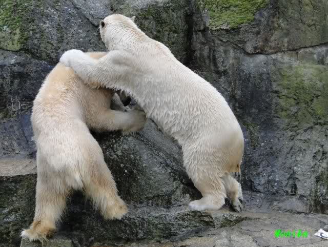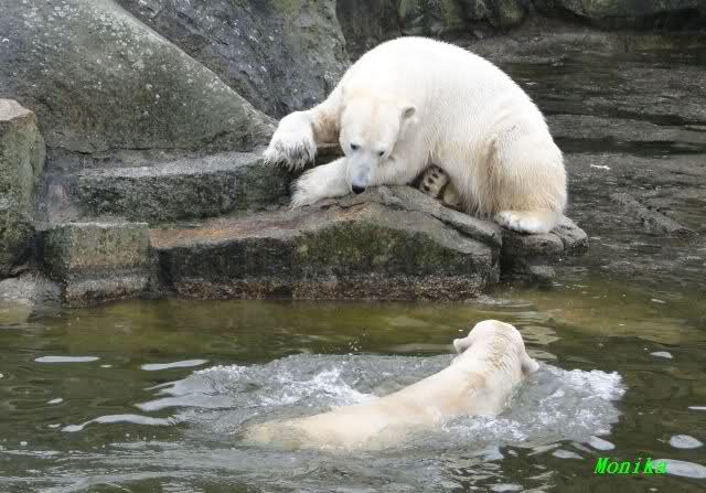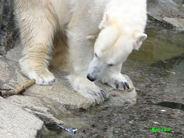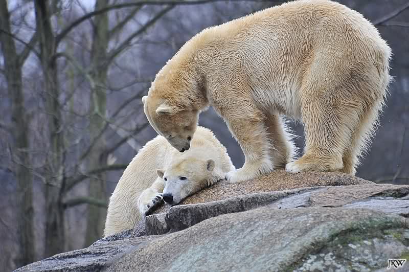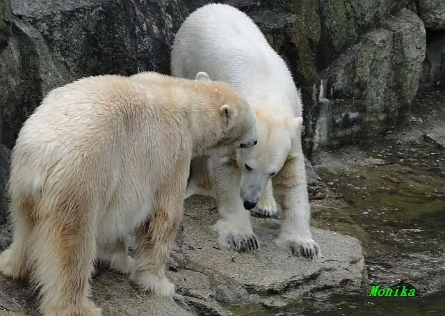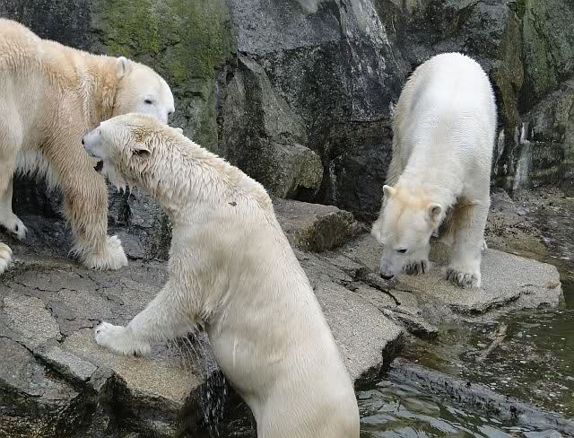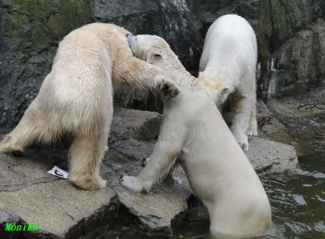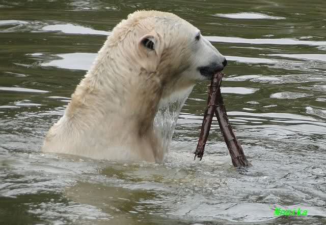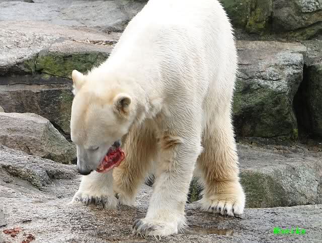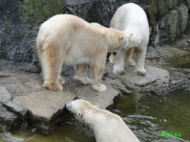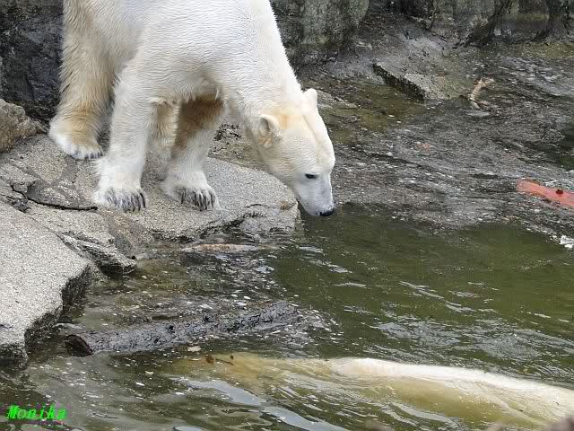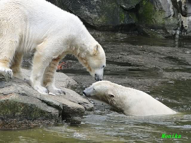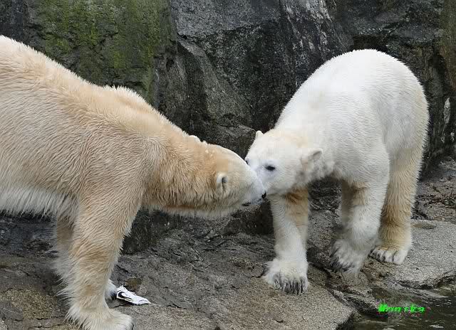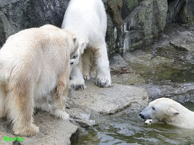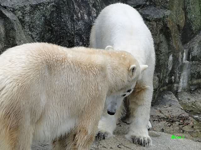 Als Knut einen Spaziergang auf der Anlage unternahm, lauerte Katjuscha schon um ihn zu jagen. Ich stand leider auf der verkehrten Seite und konnte die Beiden nicht sehen. Nur das Brummen war nicht zu überhören. Andere Knutfreunde erzählten mir, dass Nancy sich zwischen Knut und Kati stellte und auch etwas brummte. Kati ist dann gegangen. Das soll sie gestern schon einmal gemacht haben. Siieht ganz so aus, als ob Nancy auch so eine Art "Mutterrolle" für Knut übernommen hat.